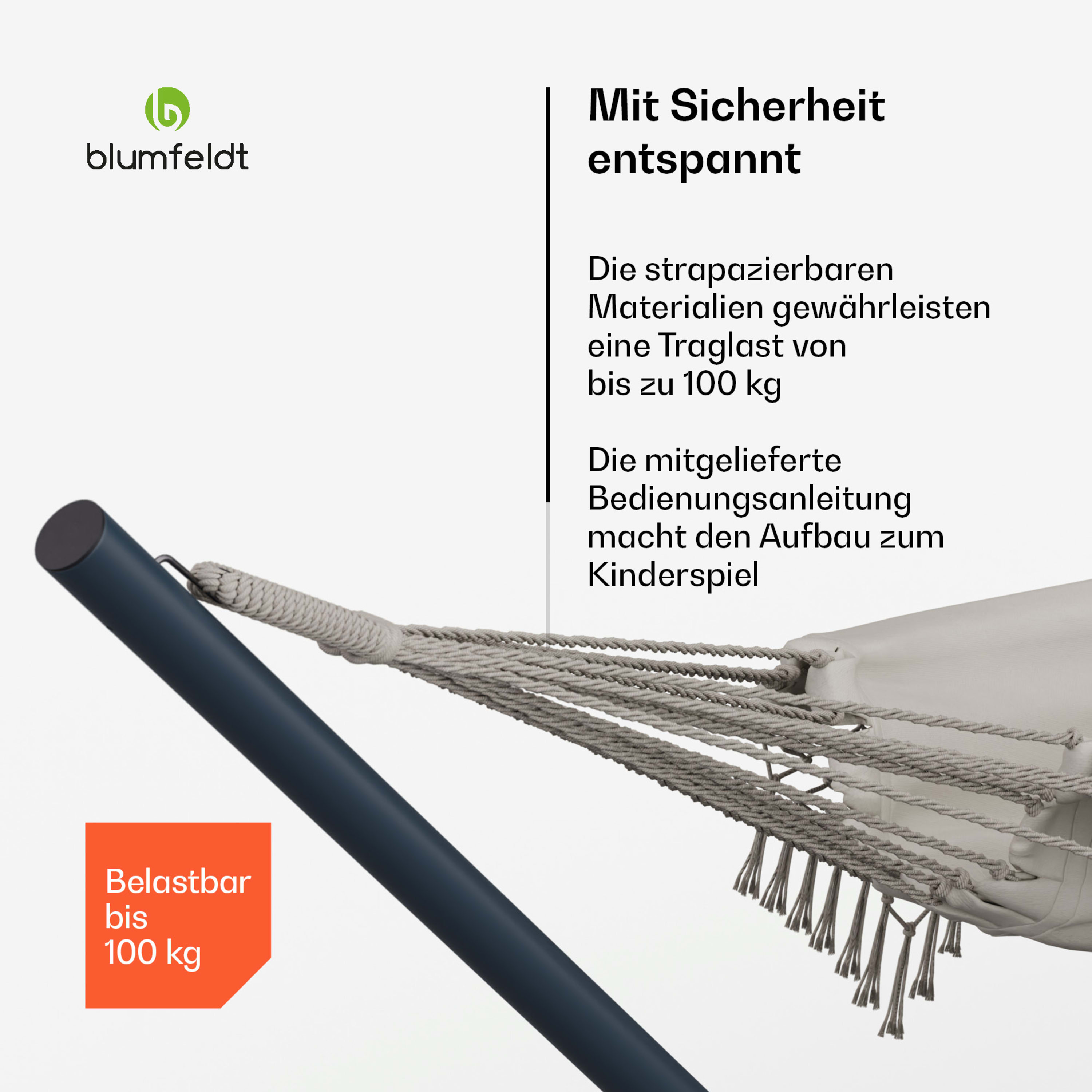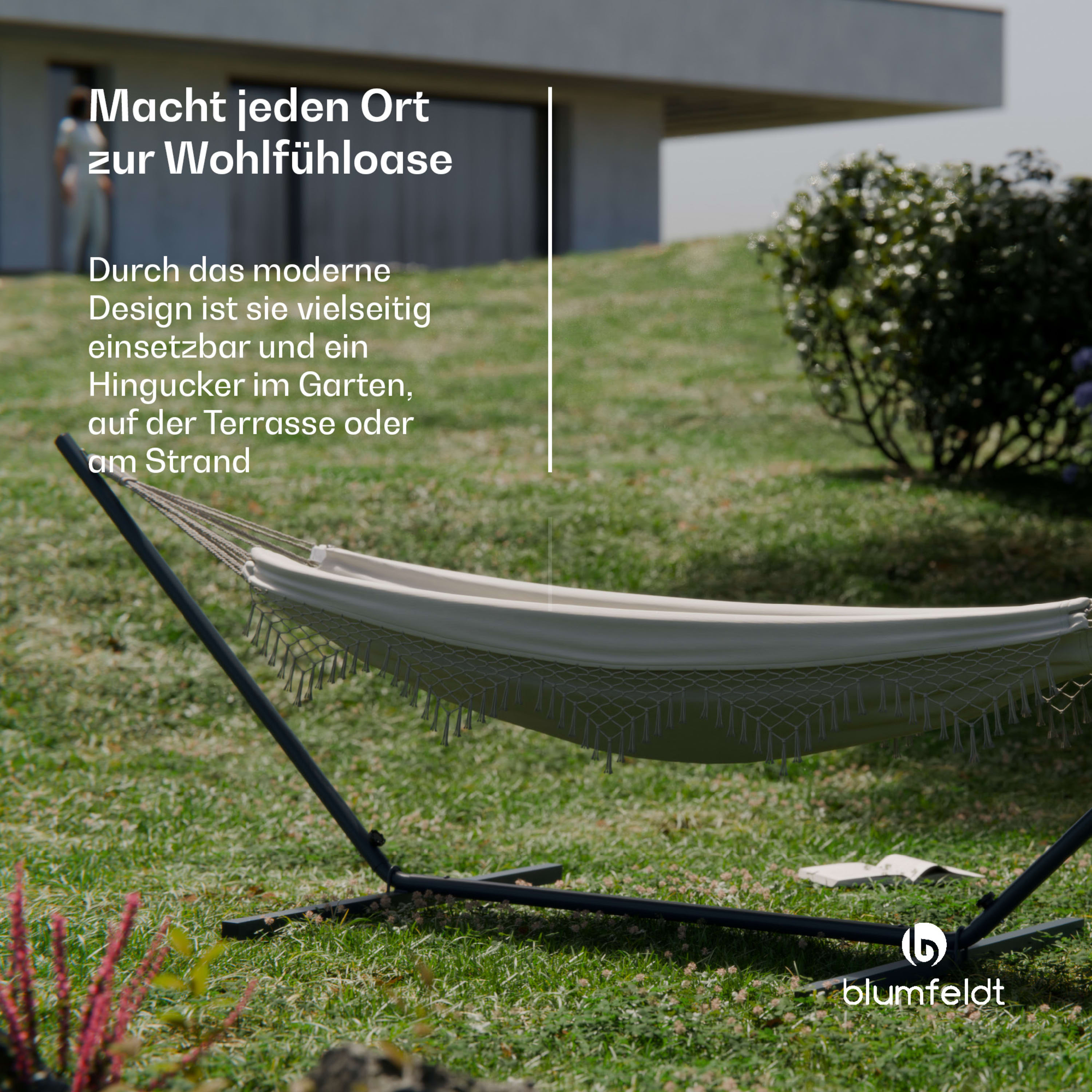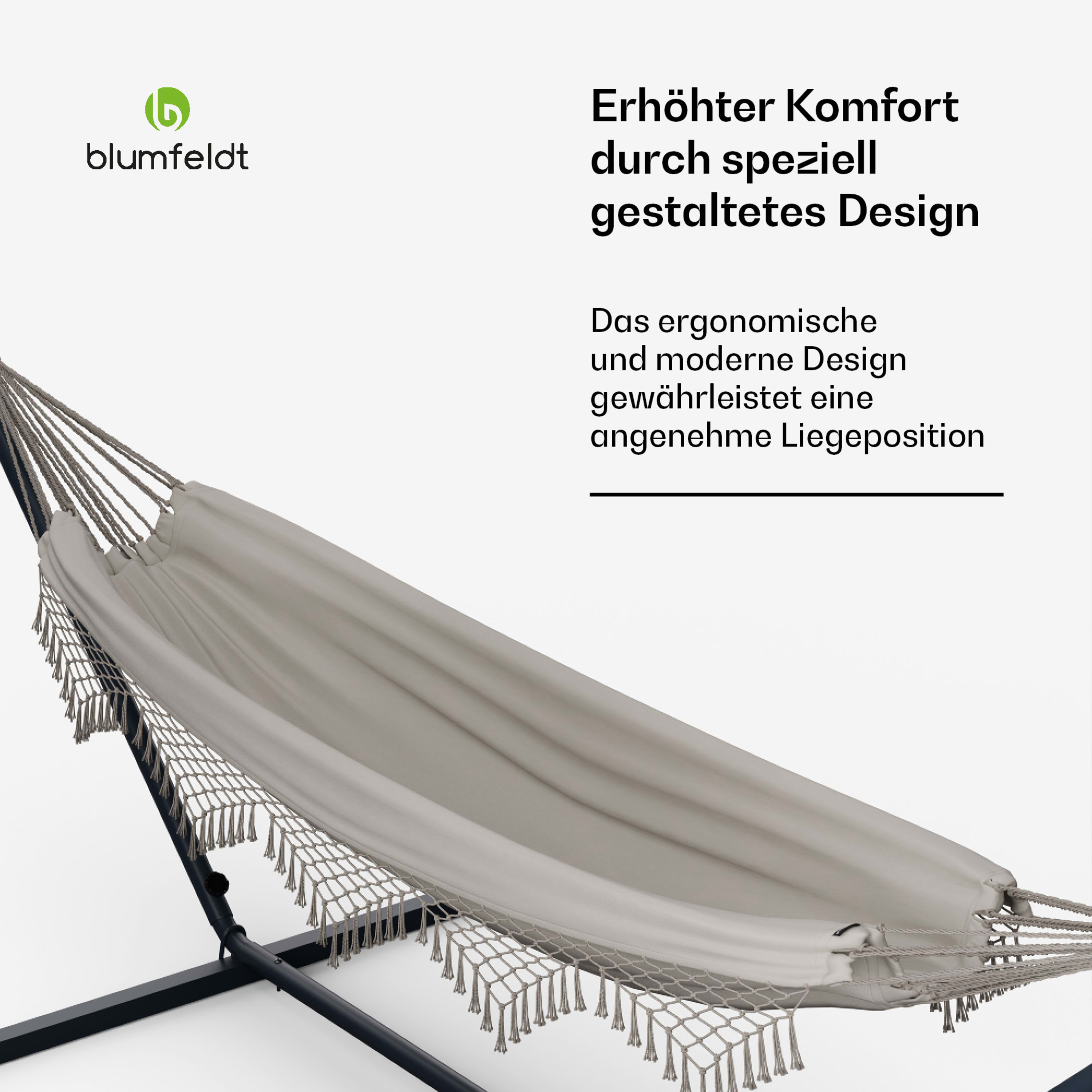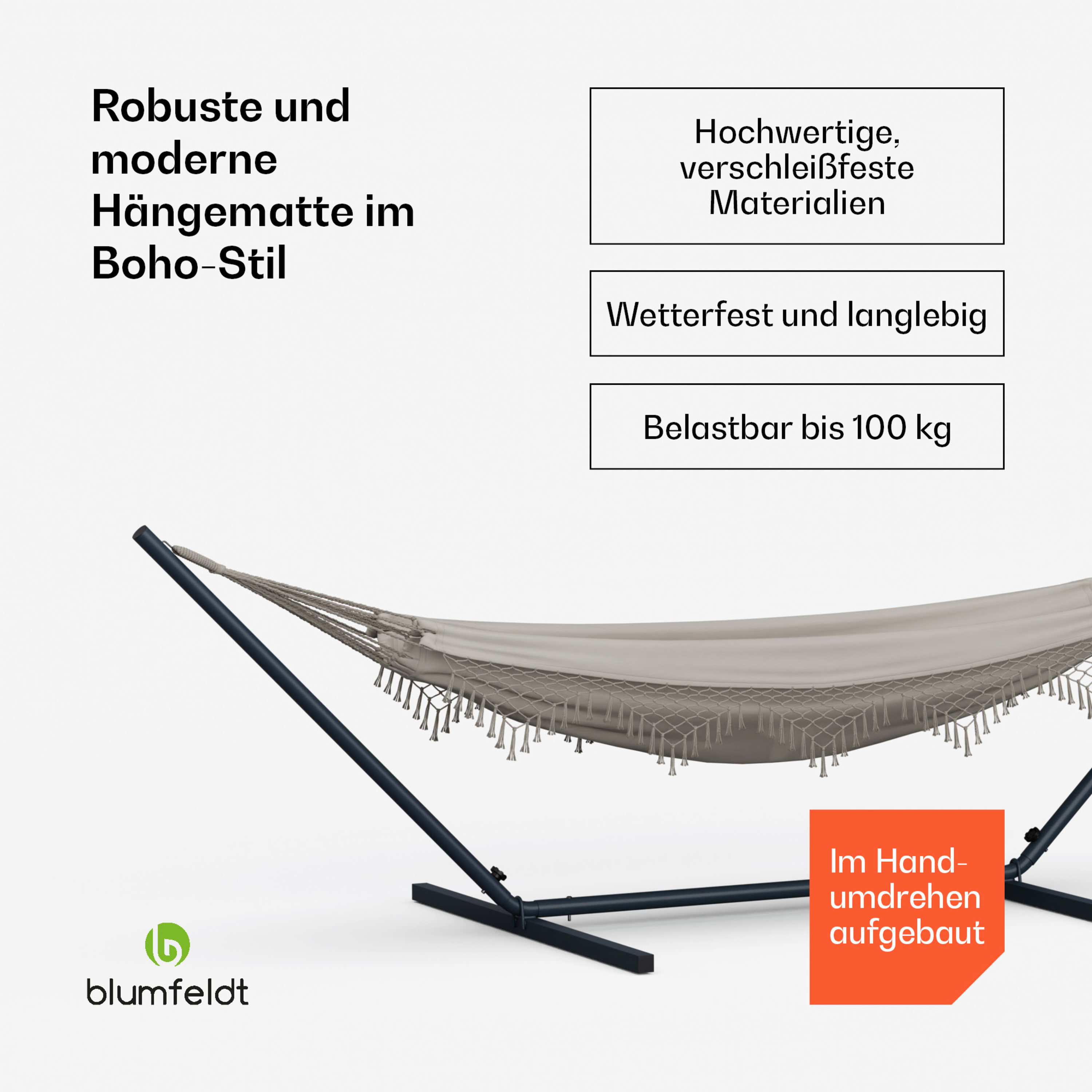 Die Blumfeldt Hängematte SwayStation Boho bietet Ihnen ultimativen Komfort und Langlebigkeit im Innenbereich oder im Freien. Gefertigt aus hochwertigen Materialien und mit rostbeständiger Beschichtung an den Haken versehen, ist sie besonders robust und wetterbeständig. Ihr ergonomisches und modernes Design gewährleistet eine angenehme Liegeposition für maximale Entspannung und sorgt für einen Hingucker in Ihrer Wohlfühl-Oase. Ob für Outdoor-Enthusiasten, Familien oder Fitnessliebhaber - die Blumfeldt Hängematte SwayStation Boho ist für jeden geeignet, der die Natur in vollen Zügen genießen möchte.