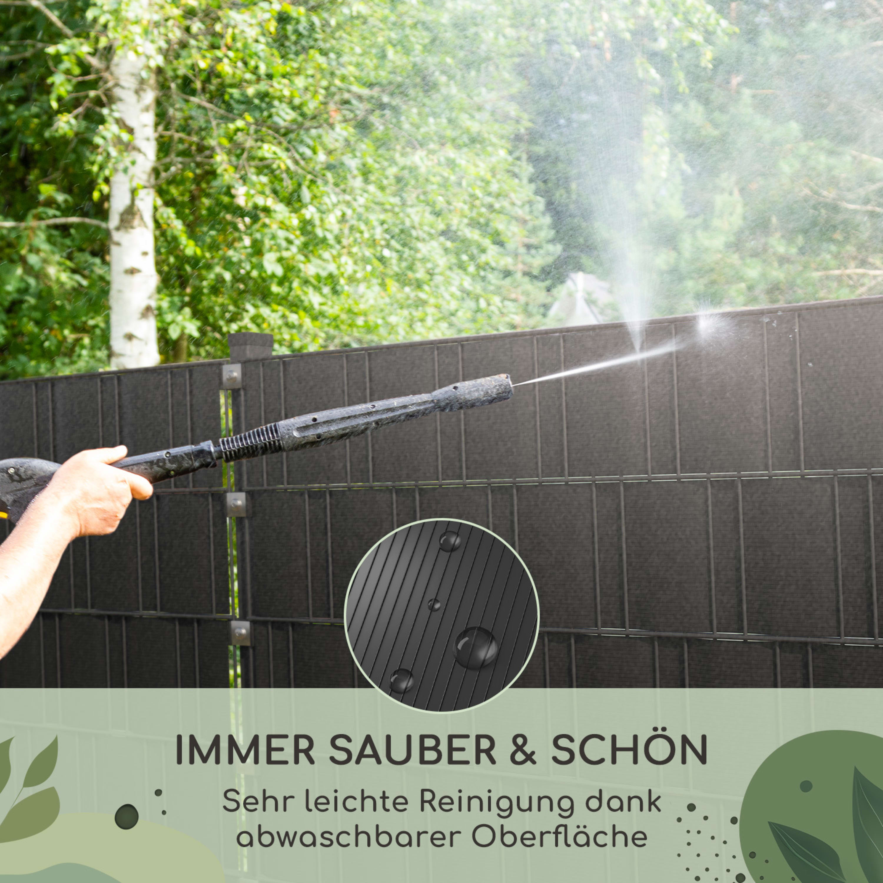 Diese Hart-PVC Streifen sind der Hammer! Sehen super aus, lassen sich bestens verarbeiten (egal ob einziehen, kürzen, oder kleine Ecken rausschneiden). Ich nehme nie wieder einen anderen Sichtschutz. Direkt 2 Pakete zu meinen schon 3 bestellten dazu bestellt!