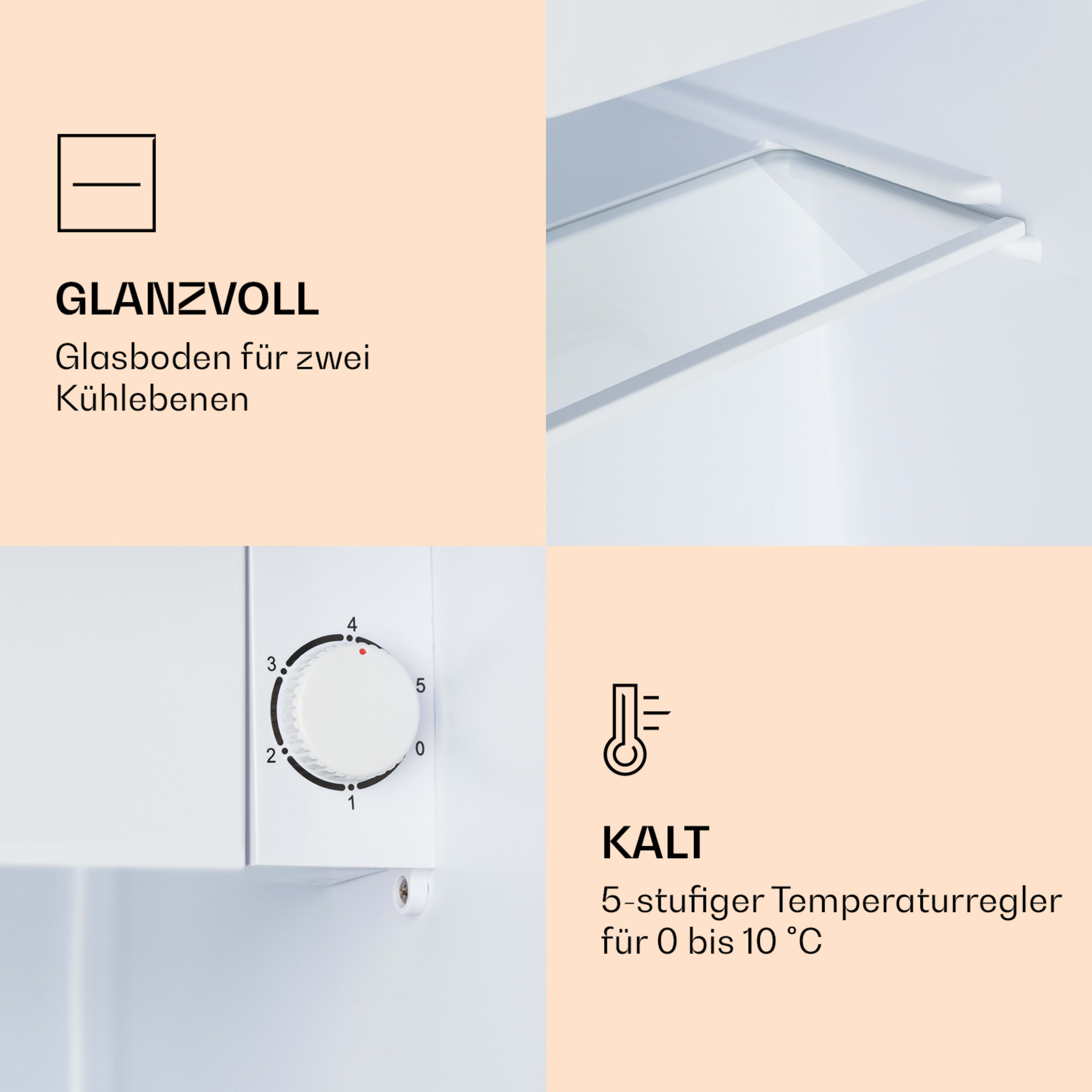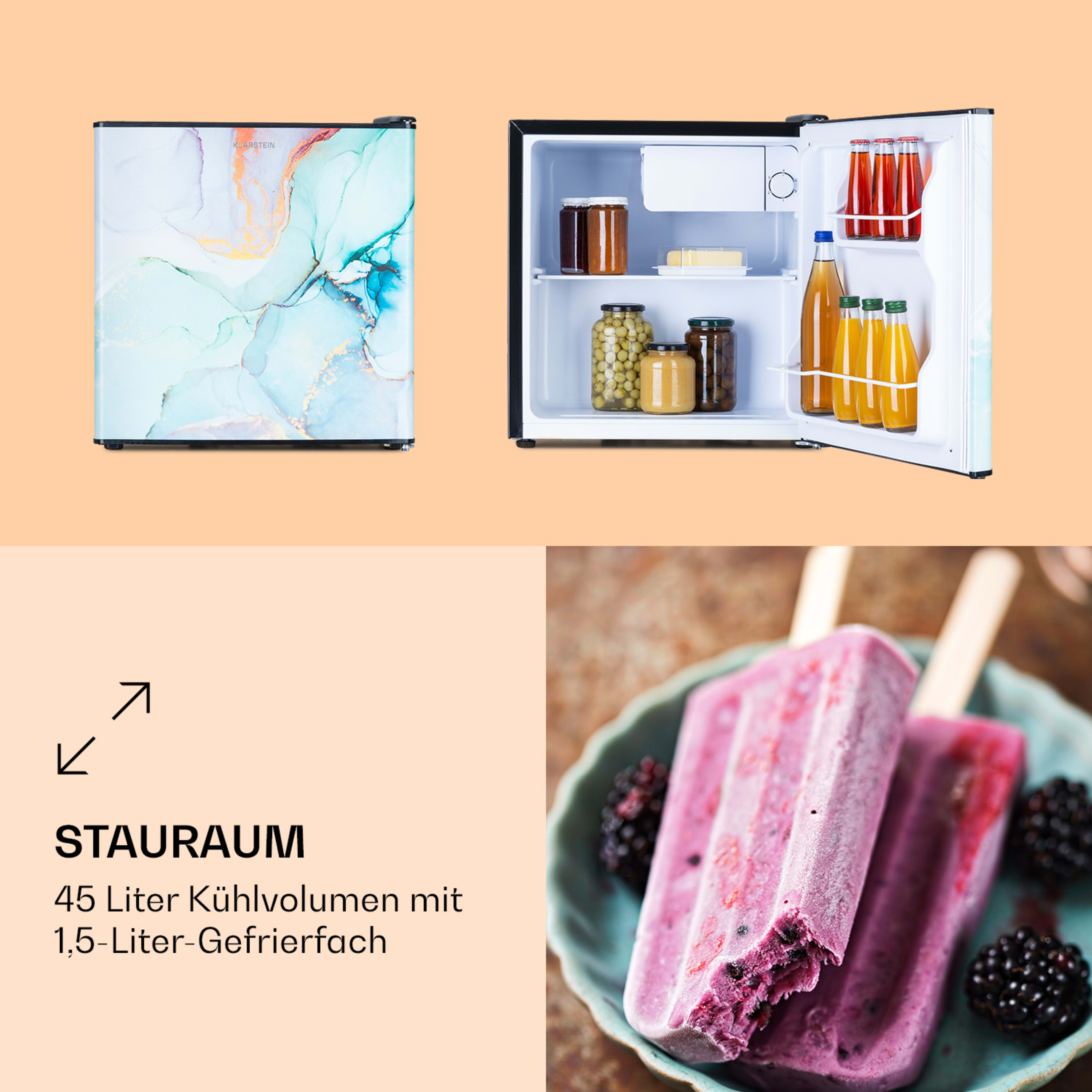 Kompakte Frische für dein Zuhause. Die Klarstein CoolArt Kühl- und Gefrierkombination vereint den Platzvorteil eines Mini-Kühlschranks mit einem kleinen 1,5-Liter-Eisfach und einer Design-Front, die Farbe in deine Küche bringt. Damit ist sie mit ihren 45 Litern Frischevolumen der ideale Kühlschrank für Singles, in Gästezimmern oder im Gartenhäuschen. Dank ihres geräuscharmen Betriebs mit nur 37 dB stört sie weder deine Gedanken, noch deinen Schlaf.