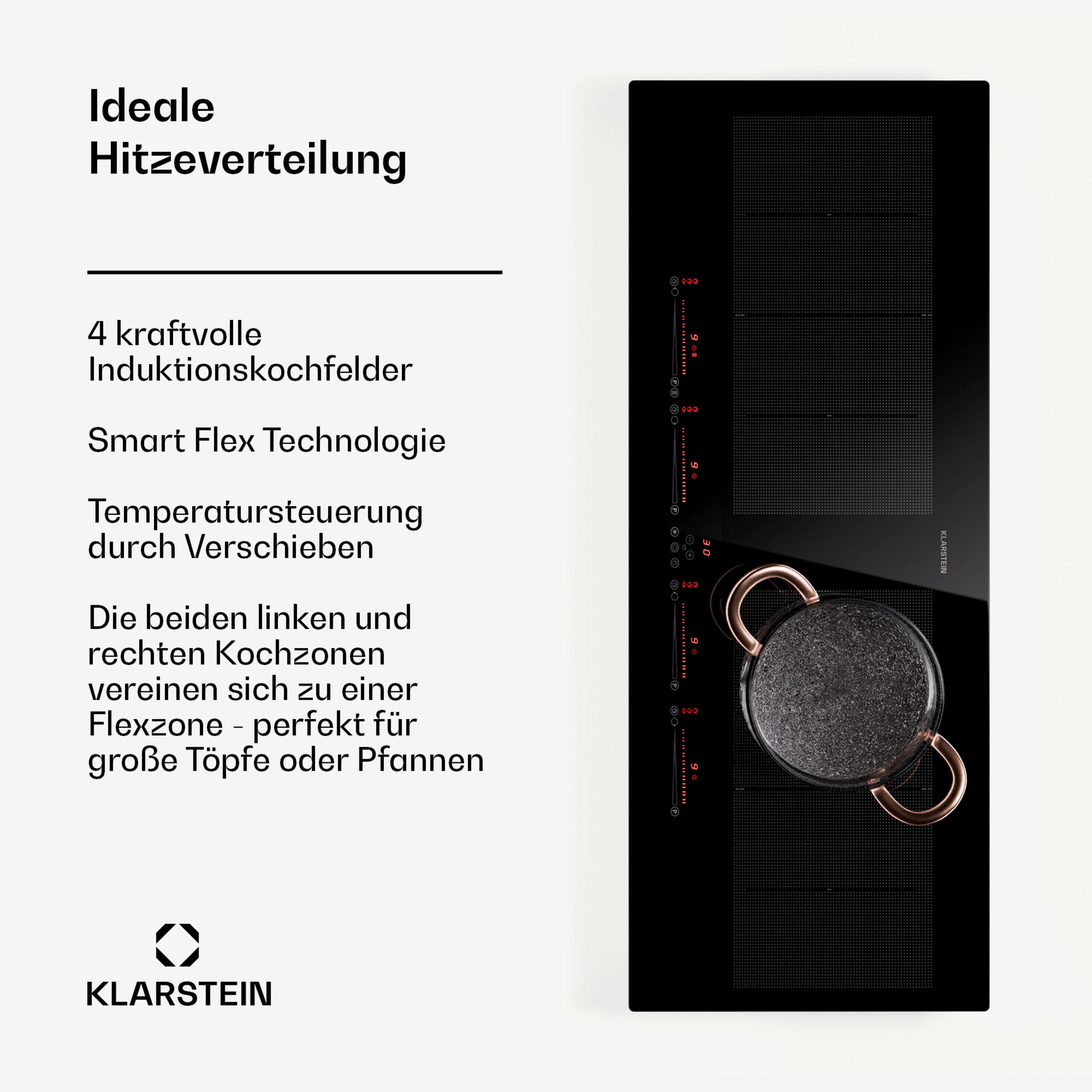 Das Klarstein Masterzone 90 Slim Flex Induktionskochfeld definiert das Kochen neu. Die Smart Flex Technology ermöglicht ein einzigartiges Kocherlebnis: Durch einfaches Vor- und Zurückschieben des Topfes wird die Temperatur automatisch angepasst. Diese revolutionäre Funktion kann jederzeit durch Antippen des Symbols auf dem Kochfeld aktiviert oder deaktiviert werden. Mit vier Kochzonen und einer Gesamtleistung von 7200 Watt bietet das Kochfeld vielseitige Kochmöglichkeiten. Das schlanke Design schafft nicht nur eine elegante Optik, sondern auch zusätzlichen Raum hinter dem Kochfeld, den man für eine Downdraft-Abzugshaube oder als Stauraum nutzen kann.