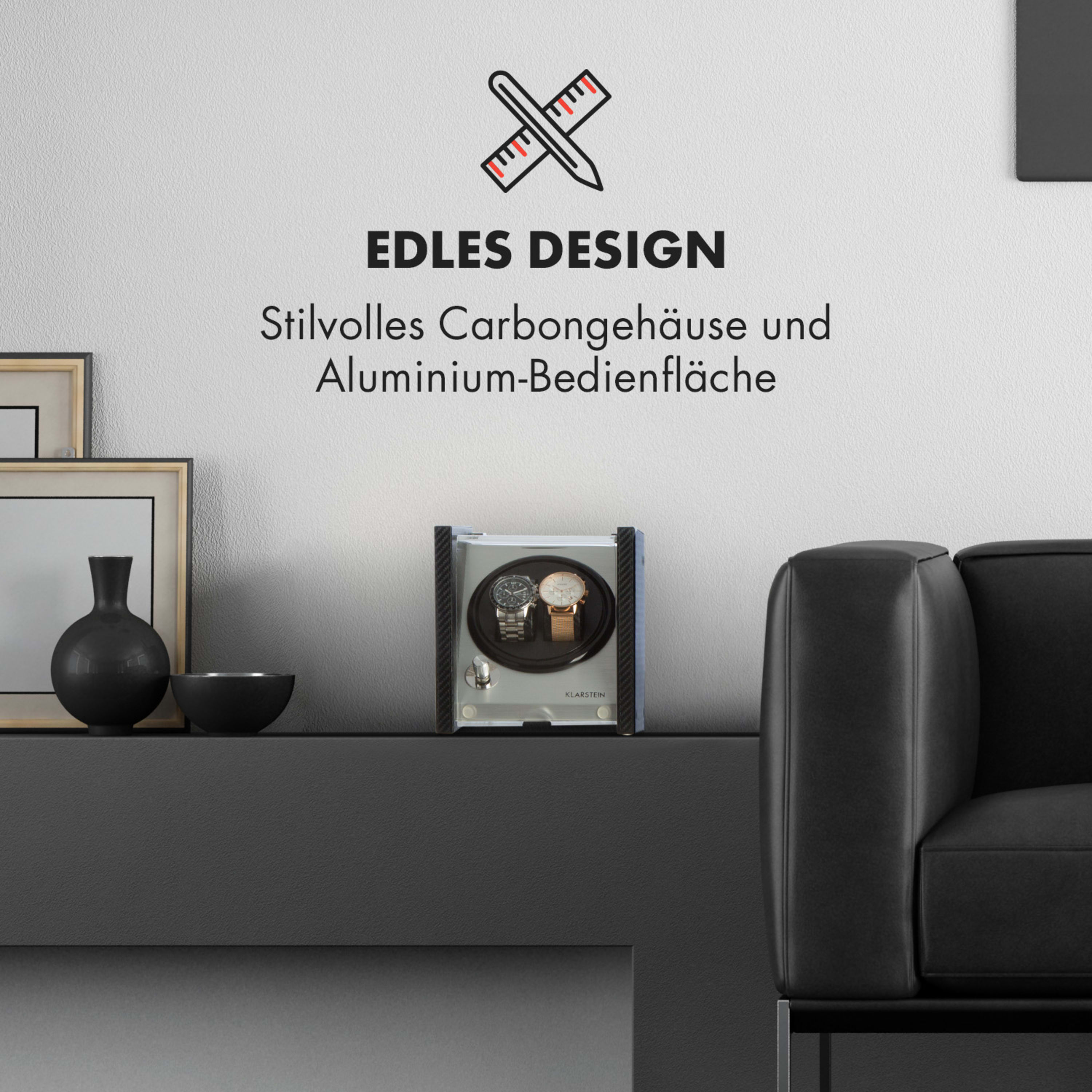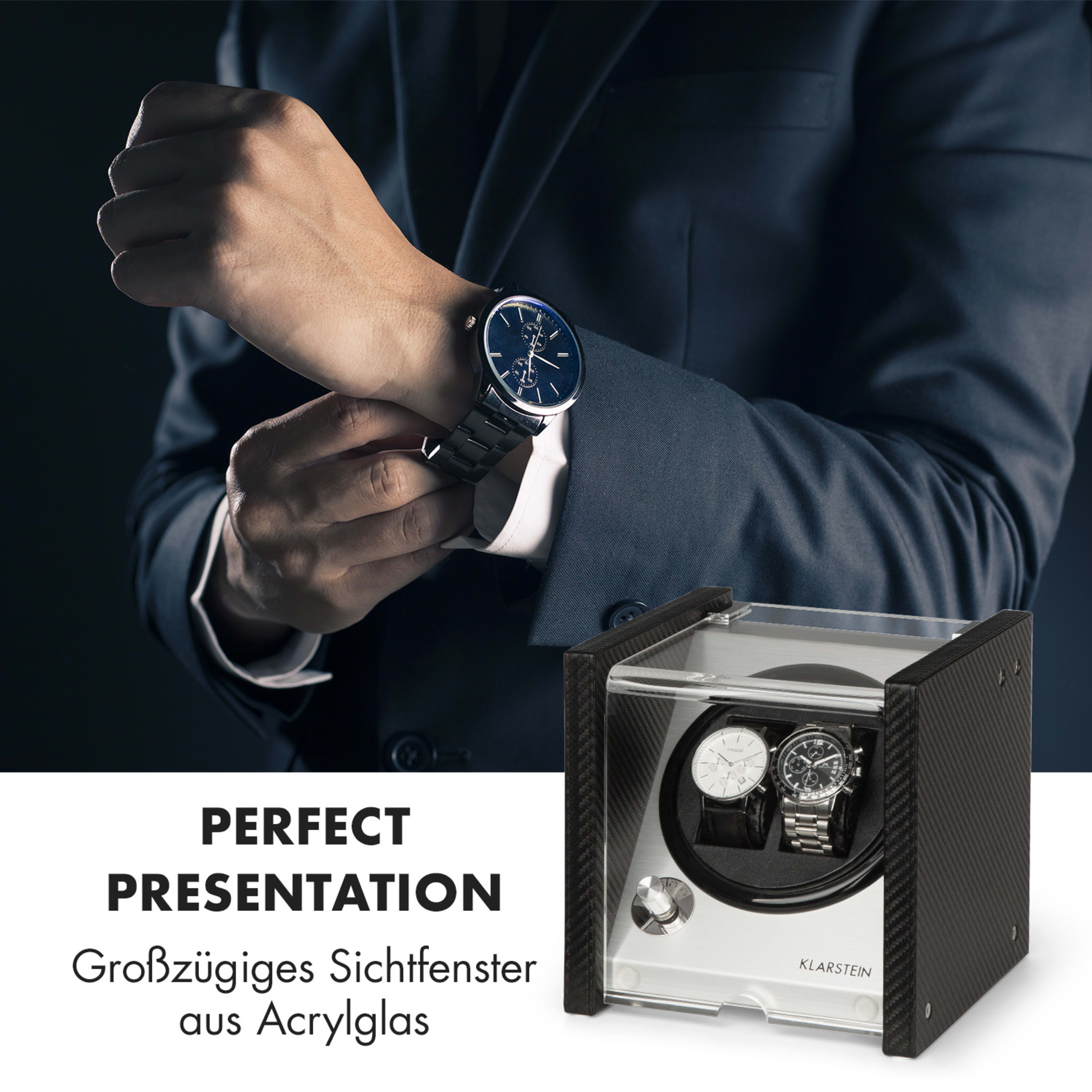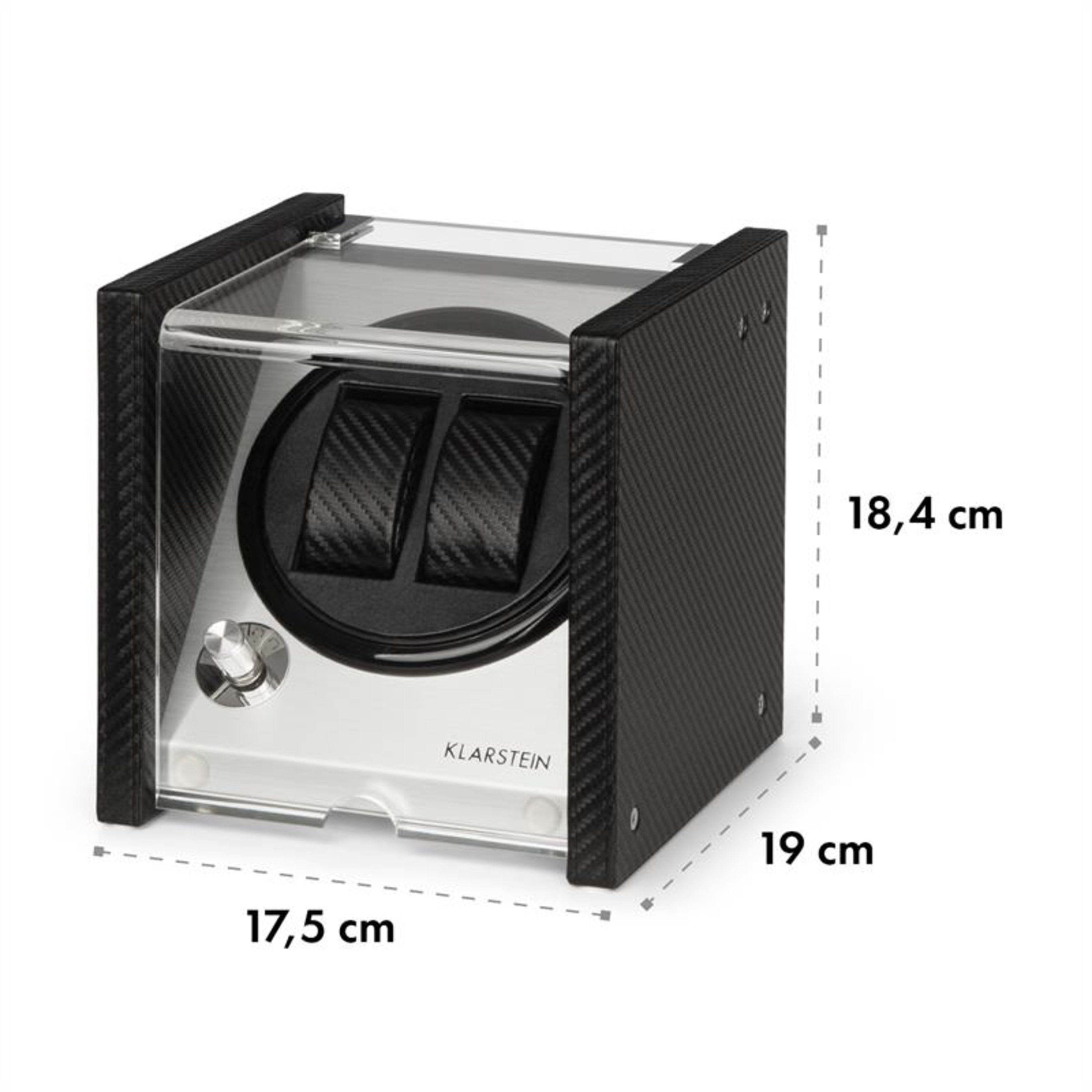 Der Tokyo 2 Uhrenbeweger überzeugt mit einem eleganten Gehäuse im Carbonfaser-Look, das sich stilvoll in jedes Raum-Ambiente einfügt. Eine Bedienfläche aus gebürstetem Aluminium verleiht der Konstruktion seinen unverwechselbaren Glanz, während das großzügig geschnittene, von oben und frontal einsehbare Sichtfenster aus Acrylglas einen unverstellten Blick auf die Automatikuhren freigibt. Der Uhrenbeweger 2 Uhren bietet dabei eine perfekte Lösung für Sammler.