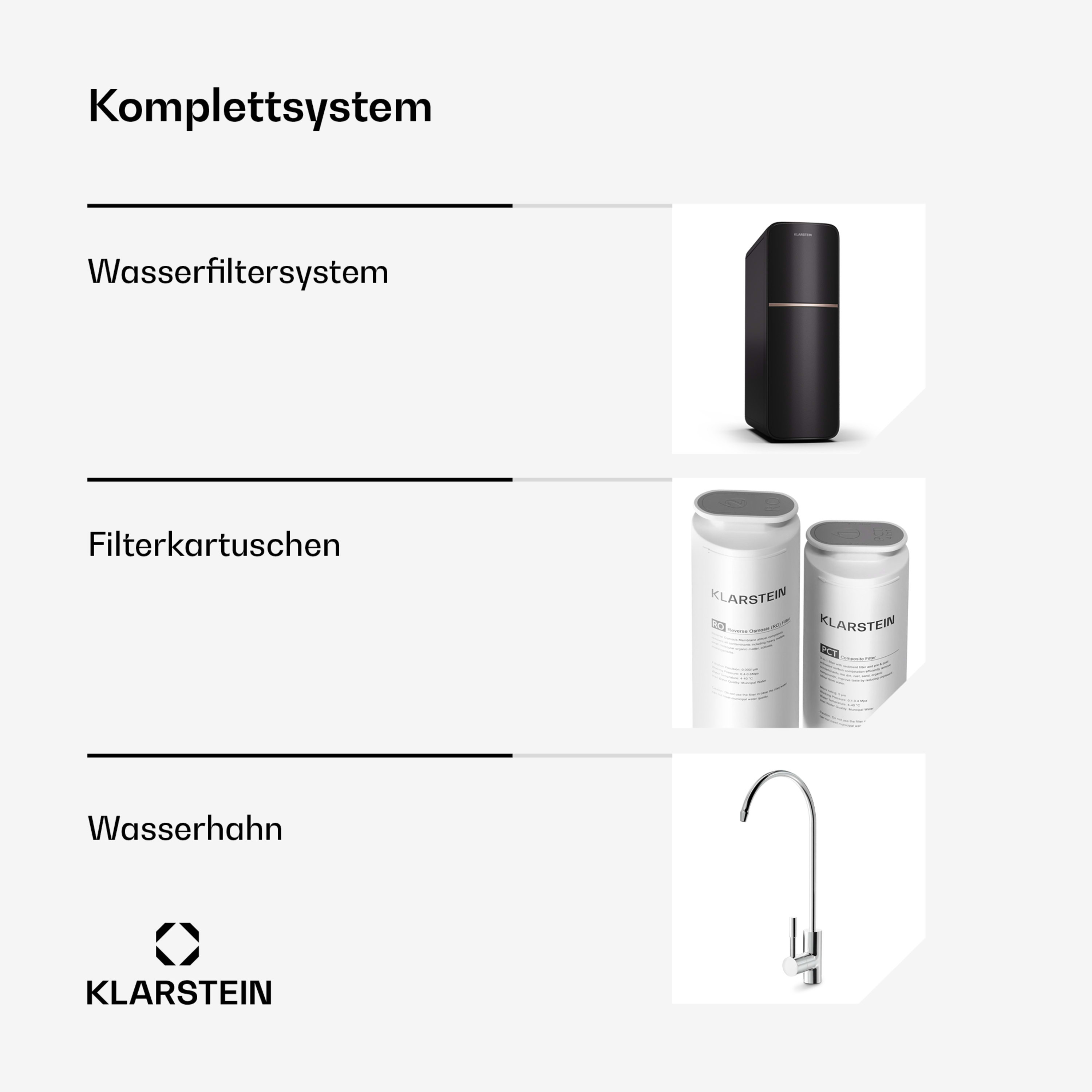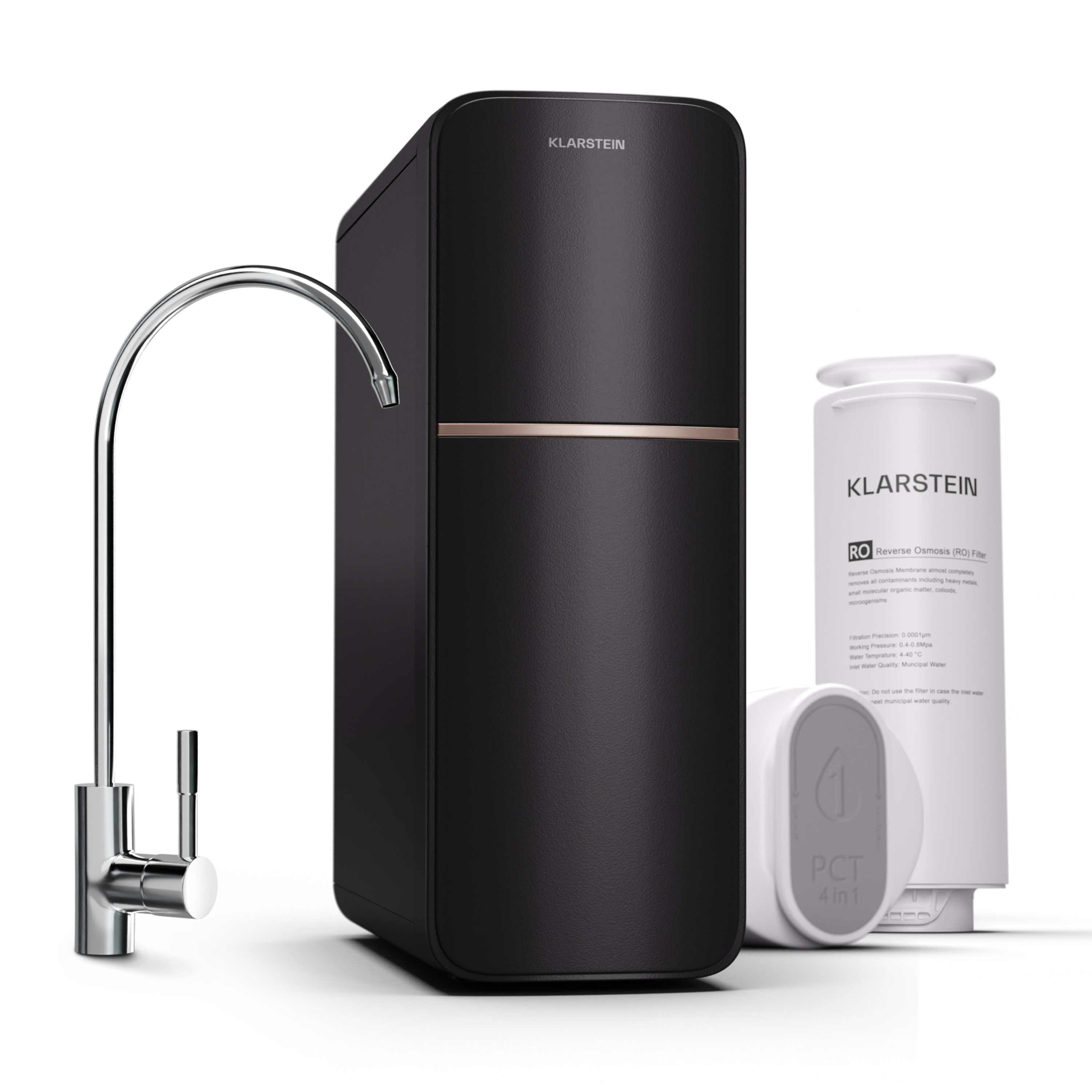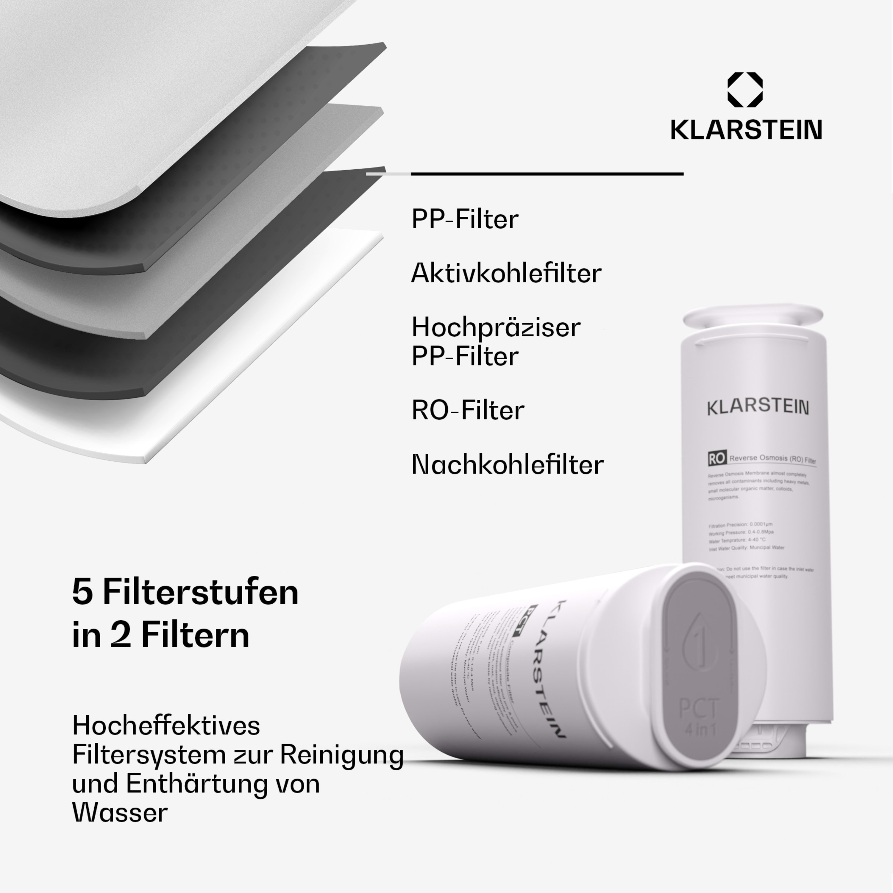 • 5 Filterstufen: 1. PP filter (Schwebteilchenfilter), 2. Aktivkohlefilter (Geruchs- & Geschmacksstoffe), 3. Hochpräzisions-PP-Filter (Feinstschwebteilchenfilter), 4. RO-Filter (Filter für gelöste Teilchen), 5. Kohlenstoff-Filter (Mikroben)