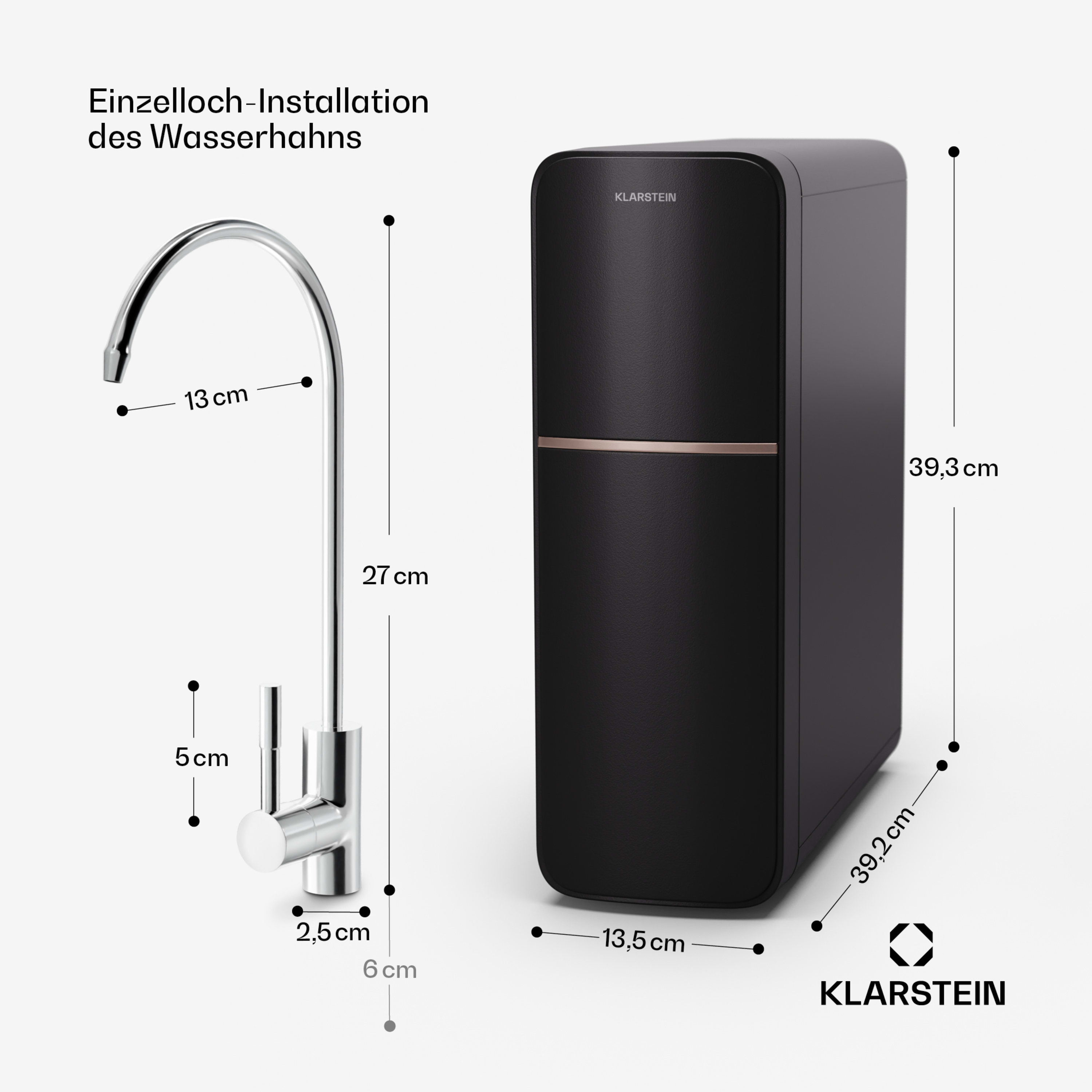 Damit dein tägliches Wasser frei von Schwebteilchen, Mikroben und Geschmacksstoffen ist, säubert es der Klarstein PureLine Wasserfilter mit 2 Filtern in einem 5-stufigen System. Dabei entfernt es über 1000 Verunreinigungen wie Blei, Chloride, Fluoride, Schwermetalle, Kalk, Geschmacks- und Geruchsstoffe und sorgt so für eine bis heute kaum gekannte Reinheit des Wassers. Dank einer Filterrate von 2 zu 1 von ungefiltertem zu gefiltertem Wasser hat das System vergleichsweise wenig Wasserverlust und reinigt bis zu 600 GPD (2270 Liter) Wasser pro Tag. Das bedeutet etwa anderthalb Liter gefiltertes Wasser in der Minute. Auch über und unter dem Spültisch macht das System eine gute Figur. Dank tanklosem Design benötigt es 70 % weniger Platz als herkömmliche Reverse-Osmose-Filter und passt damit in fast jeden Spülschrank. Intelligente Warnsysteme machen dich rechtzeitig darauf aufmerksam, wann du die beiden Filter wechseln musst. Doch keine Sorge: Je nach Verunreinigung des Ausgangswassers und Nutzung des Systems hält der PPC-Filter bis zu einem und der RO-Filter bis zu 2 Jahre. Der mitgelieferte Wasserhahn wird unkompliziert mit nur einem Loch auf dem Spültisch installiert.