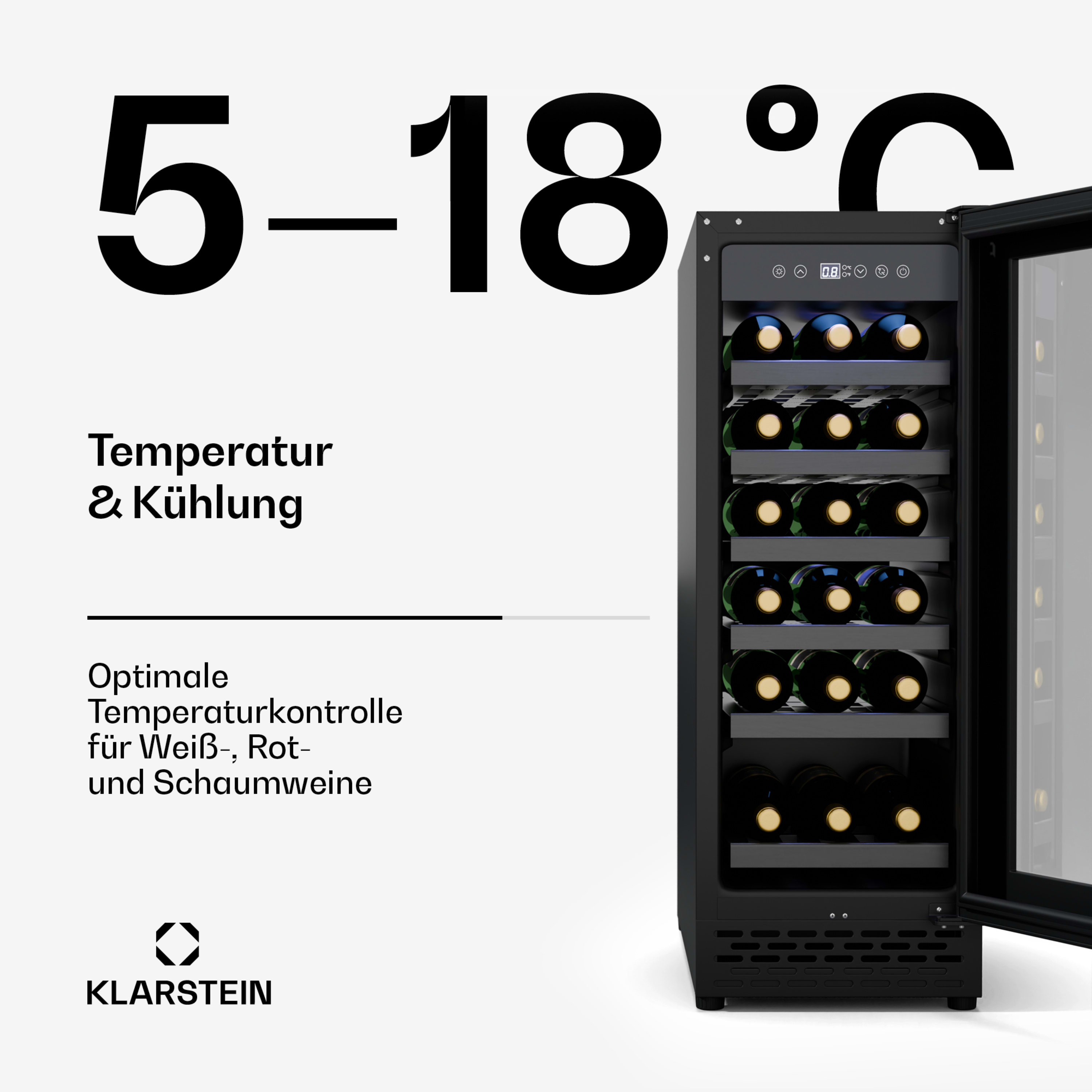 Mit einer Kühlzone, die eine konstante Temperatur von 5 bis 18°C ermöglicht, bietet der Klarstein Vinovilla 18 Uno die ideale Umgebung zur Weinlagerung. Die massiven Holzregale lassen sich leicht herausnehmen, sodass Sie bequem Flaschen verschiedener Größen unterbringen können. Dank des intuitiven LED-Bedienfeldes können Sie die Temperatur schnell und einfach einstellen. Das elegante, matt-schwarze Design und die minimalistische LED-Beleuchtung machen diesen Weinkühlschrank zu einem stilvollen Highlight in jeder Küche. Der Vinovilla ist nicht nur praktisch, sondern auch optisch ansprechend, was ihn zur perfekten Wahl für Weinliebhaber macht. Der Einbau-Weinkühlschrank fügt sich perfekt in Ihre Küchengestaltung ein.