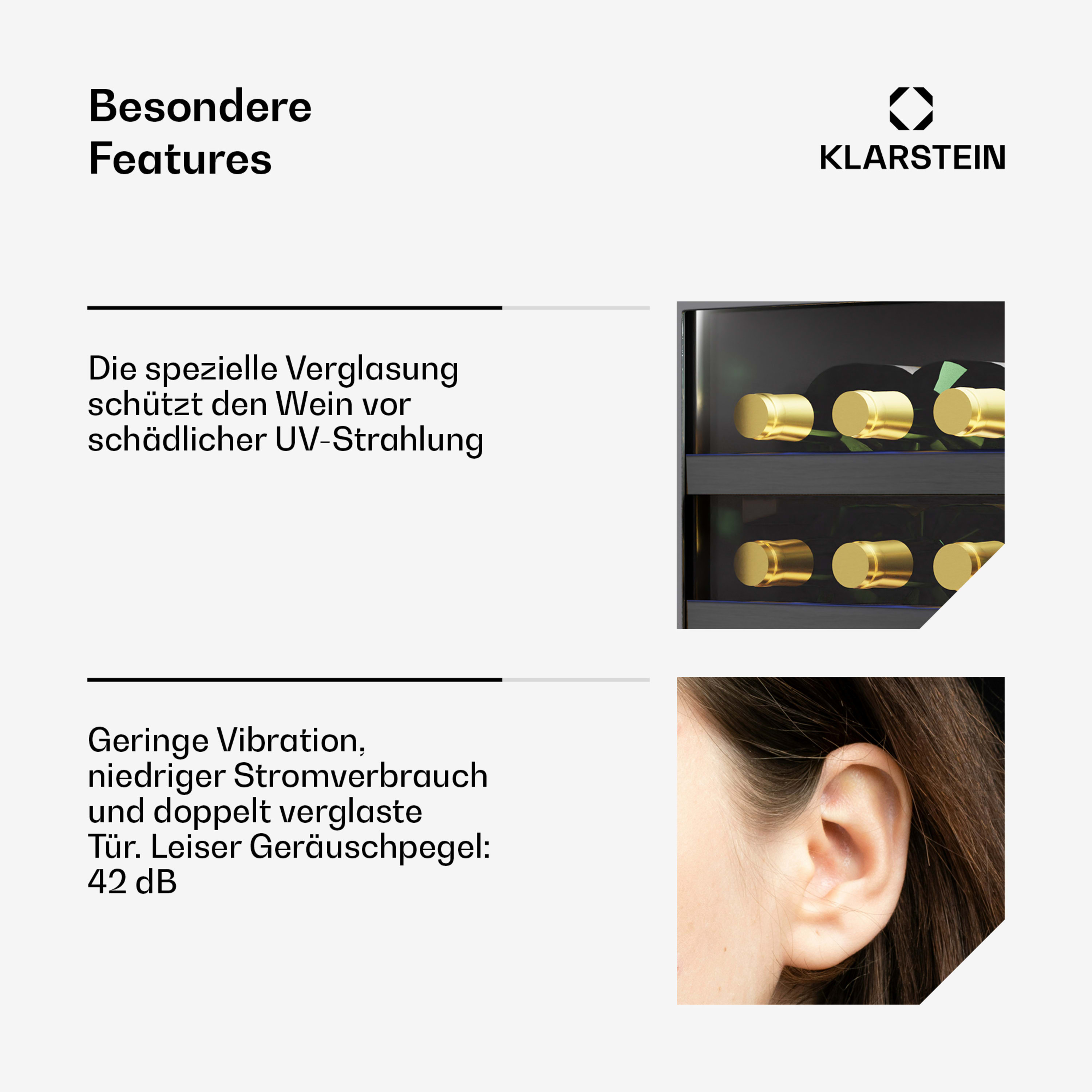 Einfach ein grandioses Produkt. Ich habe länger nach einem Weinschrank geschaut der in eine bestimmt Ecke unseres Wohnzimmers passt. Wichtig war für mich, dass ich verschiedene Weinsorten darin lagern kann, weil ich nicht den Platz für 2 Kühler habe und auch nicht das Geld für 2 ausgeben wollte. Deshalb habe ich mich schlussendlich für den Klarstein Vinovilla Duo 17 entschieden - eine durchweg gute Entscheidung wie ich jetzt finde. Zunächst mal kam er zügig, unkompliziert und ohne Schäden bei mir an, dann macht er einen wirklich hochwertigen Eindruck und sieht sehr Edel aus. Auch funktionieren tut er optimal. 2 Weinflaschen passen auf jeder Etage nebeneinander und auch die unterschiedlichen Temperaturen werden sehr gleichmäßig gehalten. Ich kann ihn also uneingeschränkt weiterempfehlen.