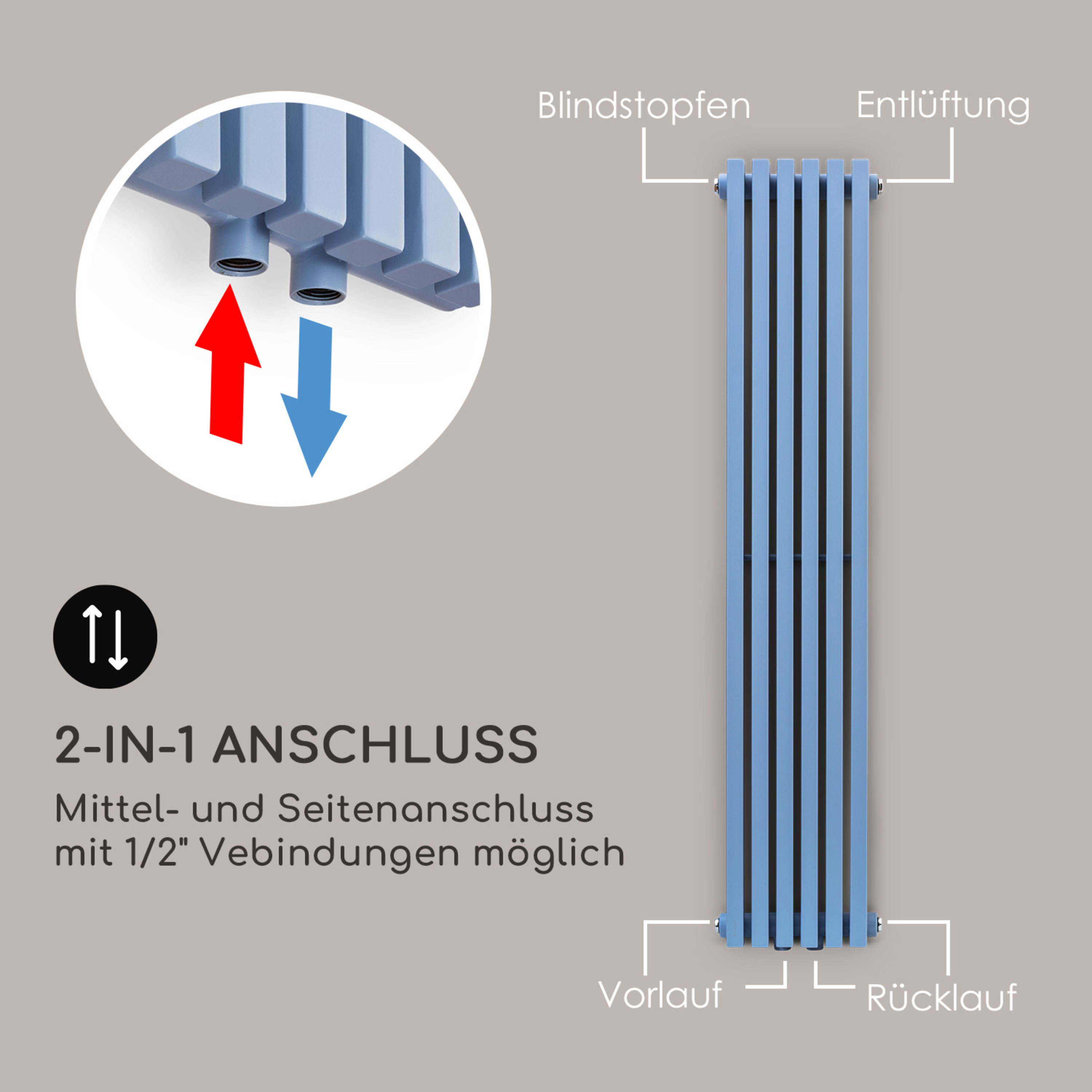 Der Blumfeldt Delgado 120 x 25 Röhrenheizkörper integriert sich ganz umstandslos in ein vorhandenes Warmwasser- oder Fernwärmeheizsystem und arbeitet auch mit elektrischen Heizstab- oder elektronischen Thermostatsystemen. Dabei spendet er zuverlässige und gleichmäßige Wärme in Räumen von 4 bis 10 m². Der Anschluss ist denkbar einfach: Die 2-in-1 Bauweise ermöglicht sowohl den Anschluss in der Mitte als auch an den seitlichen Röhren. Damit kann der Delgado optimal auf zahlreiche bauliche Gegebenheiten reagieren. Auch die notwendigen Wandhalterungen sind direkt im Lieferumfang enthalten. Das stabile Röhrensystem aus Metall leitet und verteilt dabei optimal Wärme bis 70 °C. Durch seine 6 vertikalen Heizröhren verfügt er zudem über eine optimal vergörßerte Oberfläche und erreicht so Wärmeleistungen von bis zu 508 Watt.