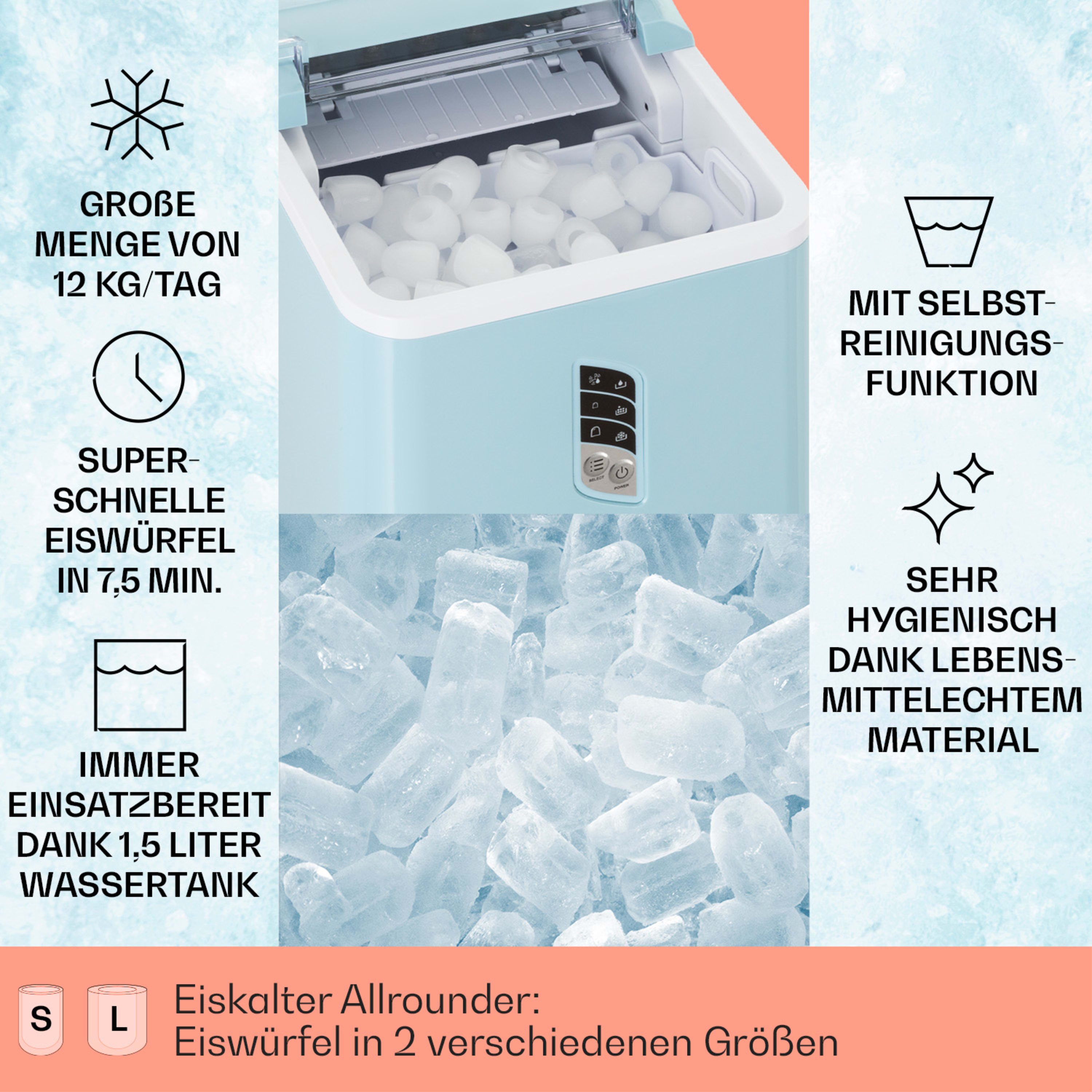 Kaltes Eis für heiße Partys! Mit dem Klarstein AlbaronEiswürfelbereiter sind deine Drinks stets erfrischend und gut gekühlt. In 24 Stunden produziert die Eiswürfelmaschine bis zu 12 kg kleines oder großes Bullet-Eis. Einfach 1,5 Liter Wasser in den Tank füllen, einschalten und schon nach 9 Minuten - oder 7,5 für kleine Bullets - fallen die ersten Eiswürfel in den 600 g großen, herausnehmbaren Auffangbehälter. Kontrollleuchten auf dem Display erleichtern die Bedienung und informieren dich, wenn du Wasser nachfüllen oder den Auffangbehälter leeren musst. Ist die Party vorüber, wird der Klarstein Albaron Ice Cube Maker dank Selbstreinigungsprogramm ohne Aufwand wieder sauber. Natürlich ist das Innenleben komplett BPA-frei.
