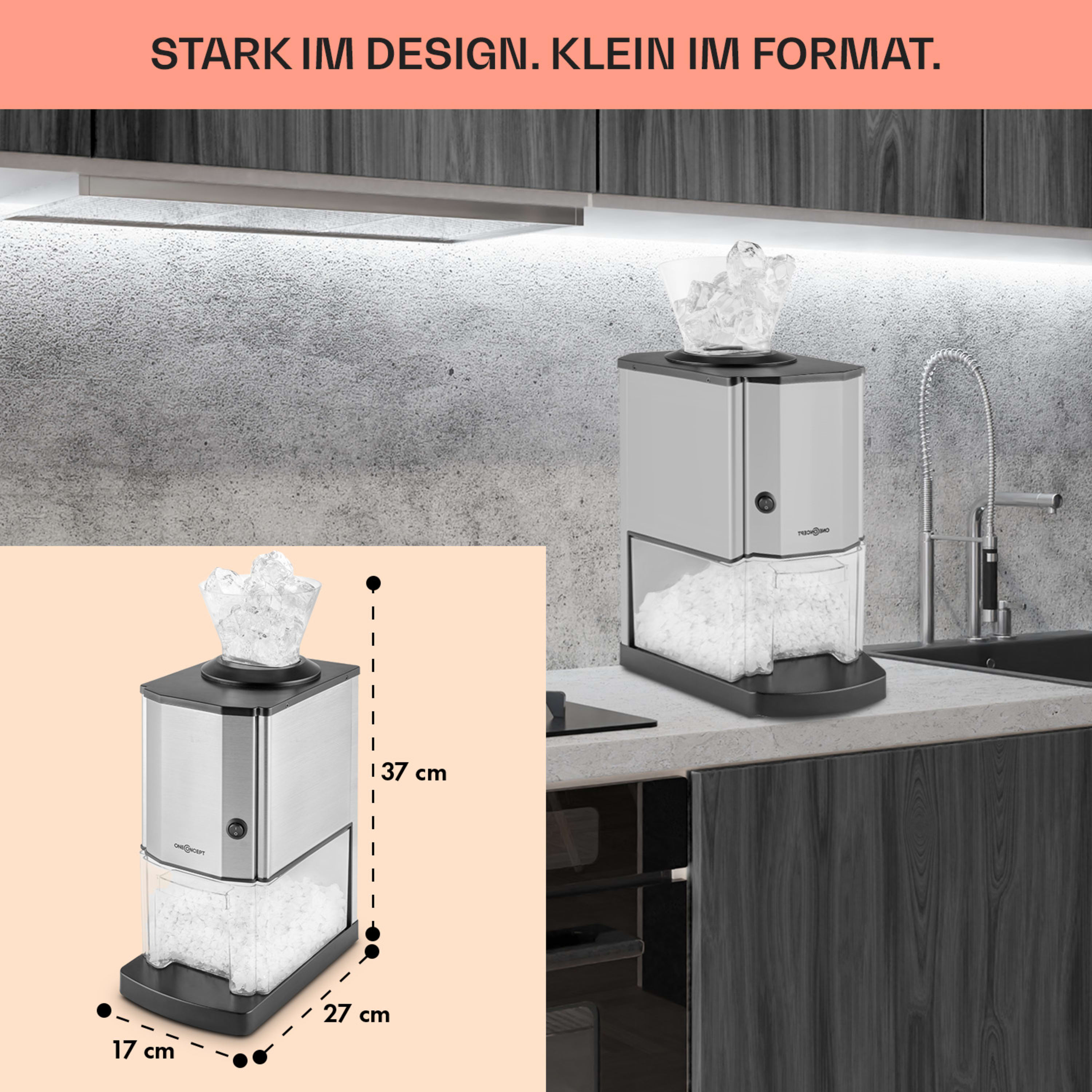 Hierbei handelt es sich hauptsächlich um eine Eiszerkleinerungsmaschine für Cocktails und zum Kühlen von Getränken im Allgemeinen. Er zerkleinert viel Eis (15 kg pro Stunde) und das sicher und nicht zu laut – ehrlich gesagt dachte ich, es wäre schlimmer. Im oberen Teil befindet sich ein Trichter, der zum Einfüllen der zu zerkleinernden Eiswürfel dient. Die Würfel müssen selbstständig fallen gelassen werden, ohne sie zu stoßen oder auf andere Weise zu berühren. Das zerstoßene Eis landet im Plastikbehälter darunter, der sich wie eine Schublade öffnen lässt. Die Maschine kann etwa 5 Minuten lang arbeiten, danach ist die Eisschublade fast voll. Die Maschine besteht aus Kunststoff mit gebürsteter Stahloberfläche. Es hat eine angenehm rationale Ästhetik. Es ist in allen Teilen robust und leicht zu reinigen. Der Klingenbereich sollte nur mit etwas kaltem oder lauwarmem Wasser abgespült werden, um Eisrückstände zu entfernen, und sollte dann von selbst trocknen. Es ist in dem Sinne sicher, dass nicht versehentlich auf die Klingen zugegriffen werden kann. Es startet nicht, wenn die Schublade falsch positioniert ist. Auf der Rückseite befindet sich ein Kühlventilator, um die vom Motor und den Messern ausgehende Hitze zu reduzieren. Es verfügt über rutschfeste Füße, um ein Verrutschen zu verhindern. Es ist ein rationales Objekt: Es zerkleinert Eis und tut es so, wie es sollte. Die Ästhetik ist schlicht und funktional. Die Mängel: Die Größe des zerstoßenen Eises ist festgelegt. Ich habe versucht, das bereits zerkleinerte Eis ein zweites Mal zu zerkleinern, um es weiter zu verkleinern: Es funktioniert zwar ein wenig, verursacht aber Staus. Das Handbuch ist auf Englisch, aber die Maschine ist einfach zu bedienen: Stellen Sie einfach den Auffangkorb auf, gießen Sie das zu zerkleinernde Eis in den Trichter und drücken Sie den vorderen Knopf. Es wird empfohlen, das Gerät während des Gebrauchs nicht an der Wand oder an hängenden Gegenständen wie Geschirrtüchern zu befestigen, da der hintere Ventilator während des Betriebs frei bleiben muss. Viel Eis wird schnell zerkleinert, ohne dass dies von Hand erfolgen muss und ohne dass das Eis übermäßig zerbricht. Letztendlich tut es, was es soll, wirkt zuverlässig und verfügt über keine unnötigen Funktionen, die es zu teuer machen würden. Der Versand erfolgt aus Deutschland, das erklärt einiges ;)
