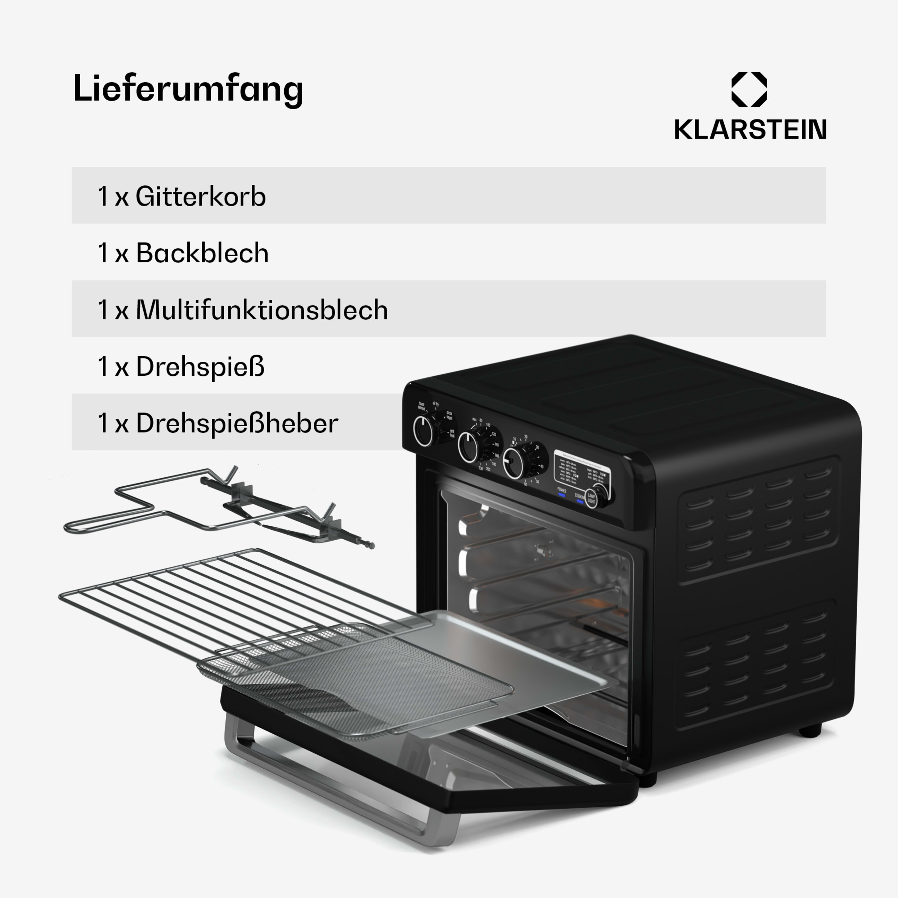Programme: Heißluft-Frittieren, Toasten, Rottisserie, Grillen, Backen, Bagel, Pizza, Warmhalten, Auftauen