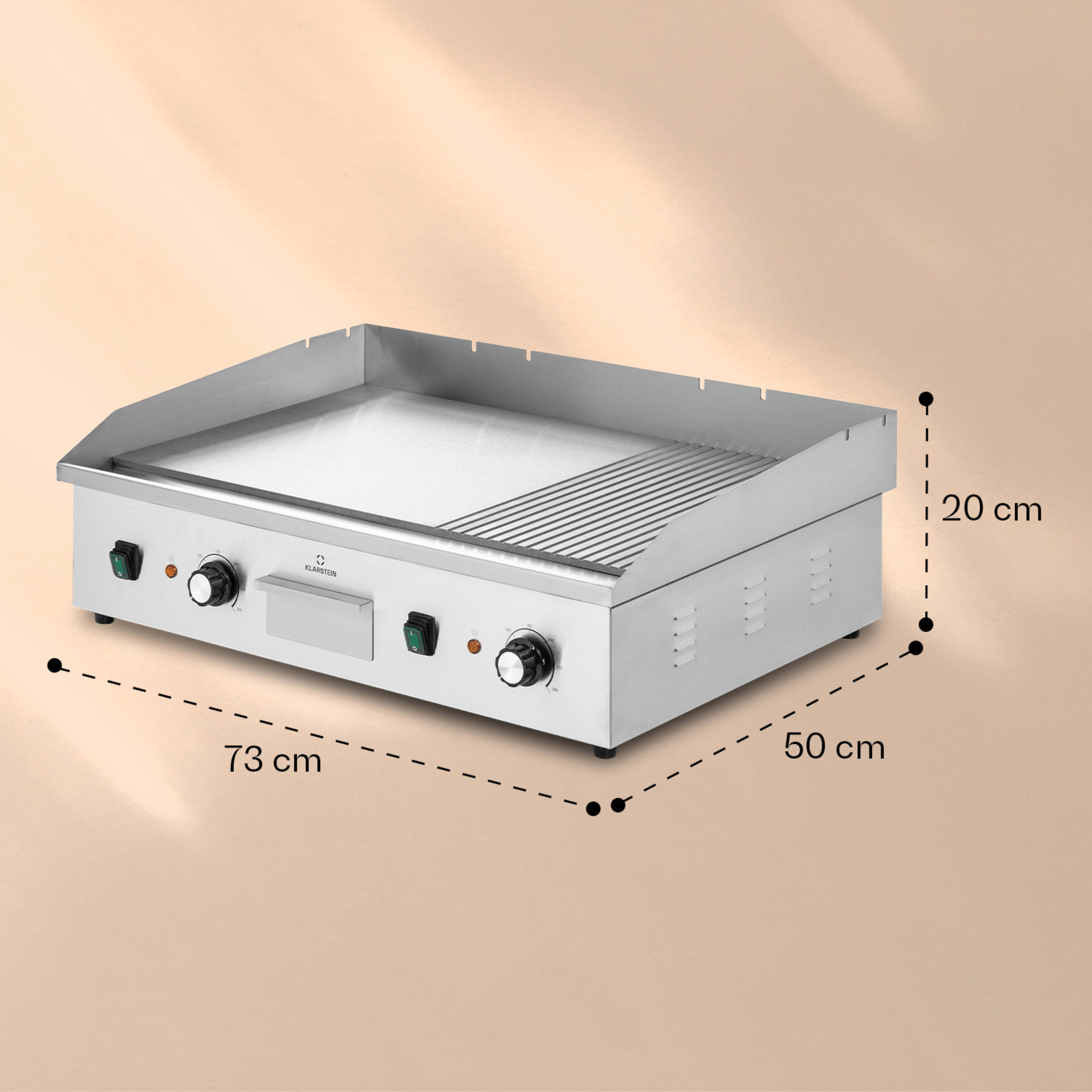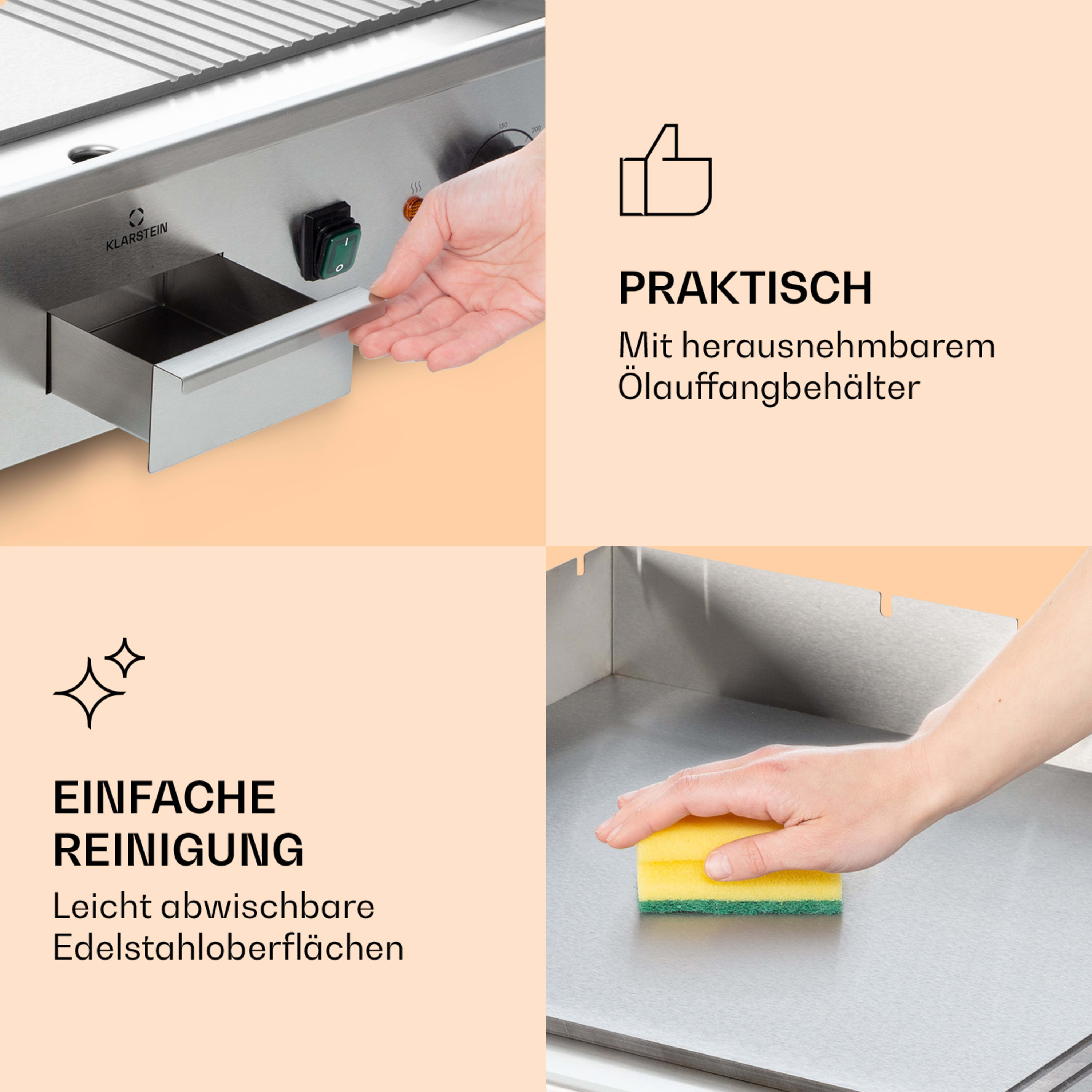 Mit 2 x 2200 Watt Leistung und einem Temperaturbereich von 50 bis 300 °C bräunt und gart er auf seiner 73 x 42 cm großen Grillplatte ohne Unterlass Steaks, Würstchen oder direkt ganze Pfannengerichte. Ein dreiseitiger Spritzschutz sorgt für Sicherheit und bietet praktischen Widerstand beim Wenden. Überschüssiges Öl fließt in die herausnehmbare Auffangschale und kann am Ende des Grillevents einfach entsorgt werden. Auch die anschließende Reinigung gestaltet sich dank des Edelstahlgehäuses besonders einfach.