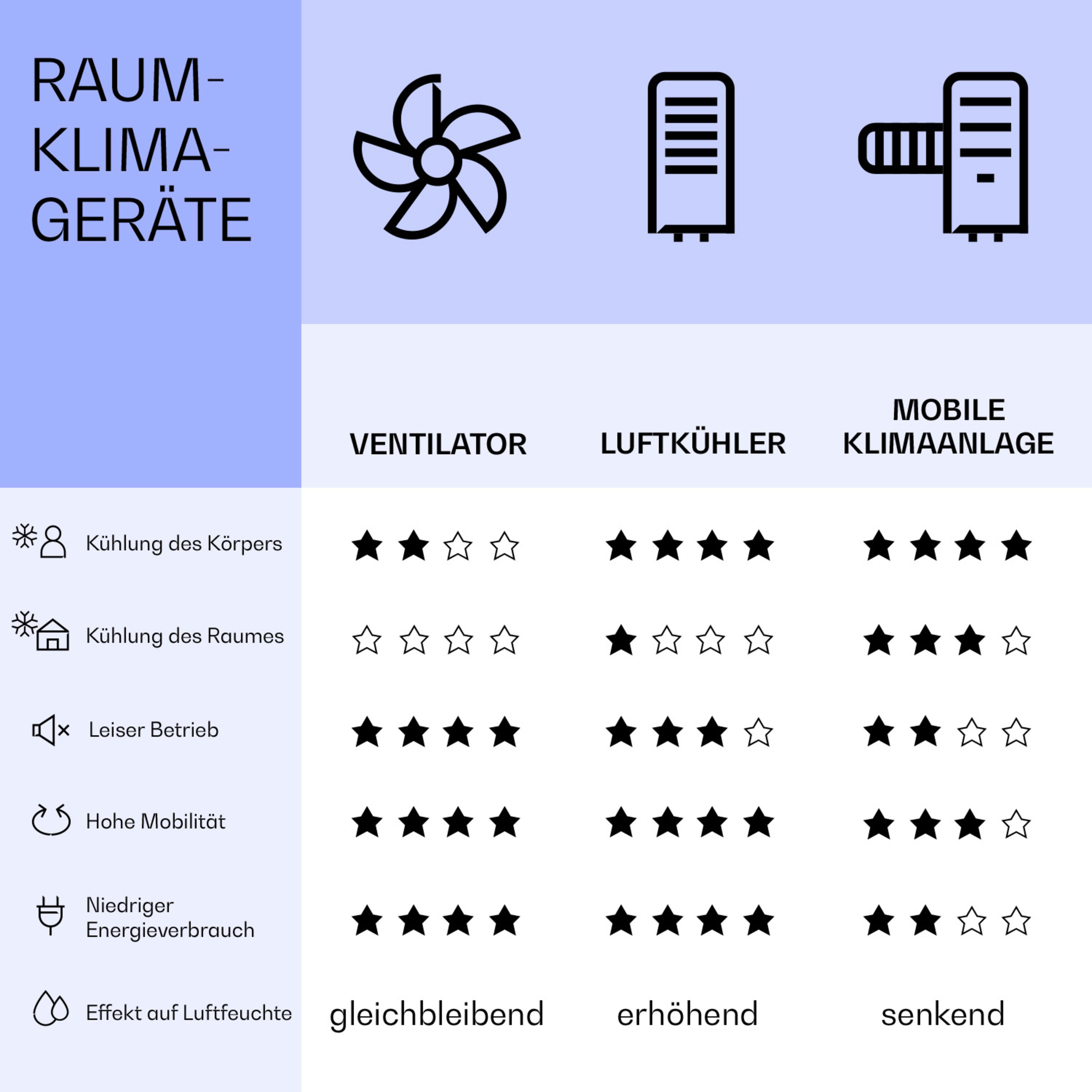 Sieht gut aus, ist gut verarbeitet und verbraucht relativ wenig Platz. Die verschiedenen Kühlmodi sind nicht nur eine Spielerei, sondern fühlen sich auch gut an (obwohl kein deutlicher Unterschied zwischen "natürlichem und Schlafmodus" besteht). Die Kühlungspower hängt mit der Temperatur des Wassers im Tank zusammen - wer also sehr kühle Luft möchte, muss sich darum kümmern das Wasser mit Kühlflaschen z.B. entsprechend abzukühlen. Achtung: Obwohl es nicht explizit verboten ist, sollte man keine Eiswürfel in den Tank einfüllen und das Gerät starten - der Schlauch, welcher das Wasser ansaugt kann sich daran "verschlucken" und die Wasserkühlung wird unbrauchbar bis der Eiswürfel geschmolzen ist. Fazit: Auf jeden Fall besser als ein herkömmlicher Standardventilator, kühlt auch ohne Wasser gut und mit entsprechend gekühltem Wasser sehr gut.