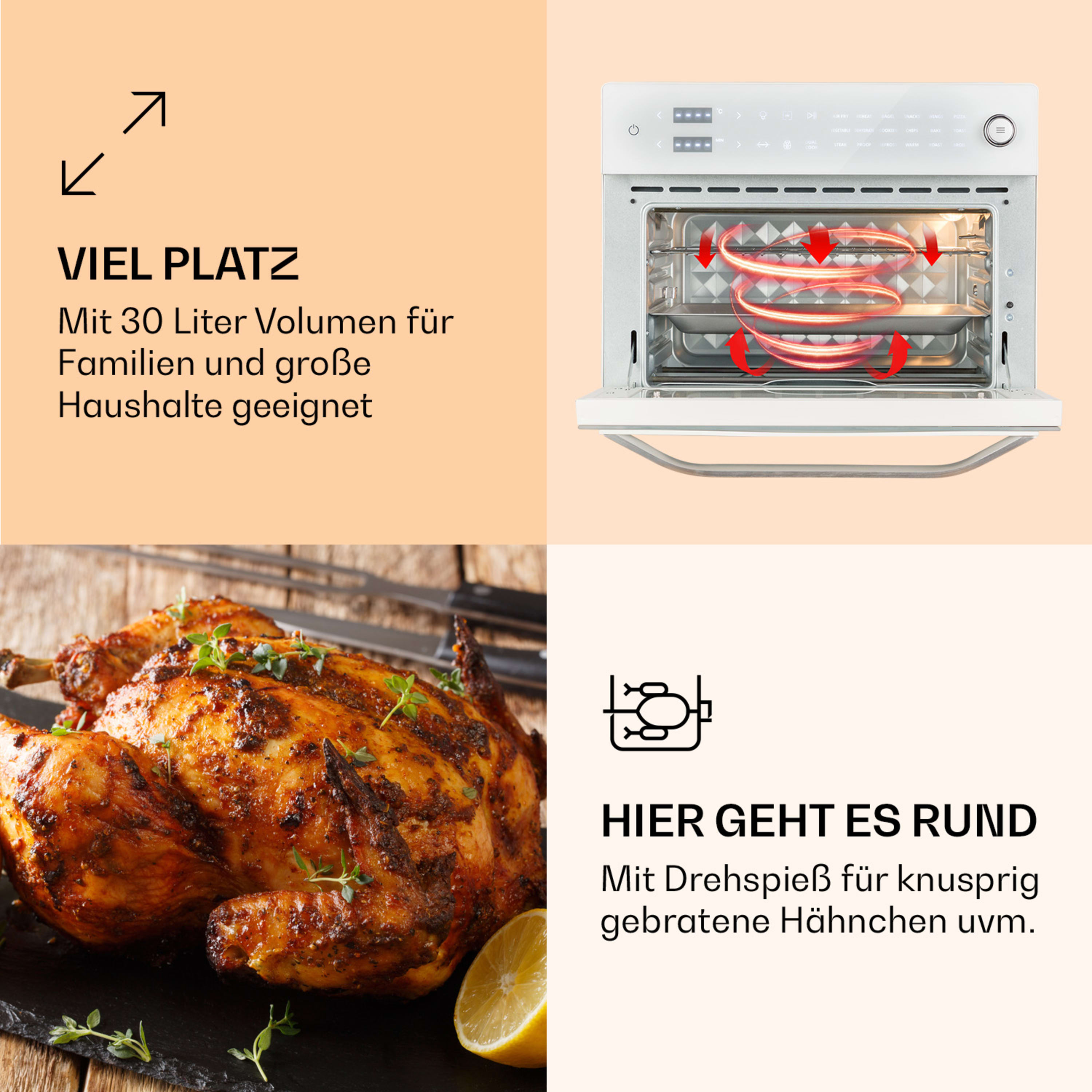Frittieren, Backen, Grillen oder Rösten - all diese Funktionen sind dank der zwei Heizelemente (Ober-und Unterhitze) für den Vigor Air kein Problem. Mit 18 vorsteingestellten Programmen und einem übersichtlichen Touch-Panel kommst du ganz einfach und bequem in den Genuss zahlreicher leckerer Speisen. Dank einem Volumen von 30 Litern ist das ansehnliche Gerät sehr geräumig und eignet sich besonders für Familien oder große Haushalte. Spezielle Funktionen wie das Duale Kochen sowie ein umfangreiches Zubehörset lassen dabei keine Wünsche offen.