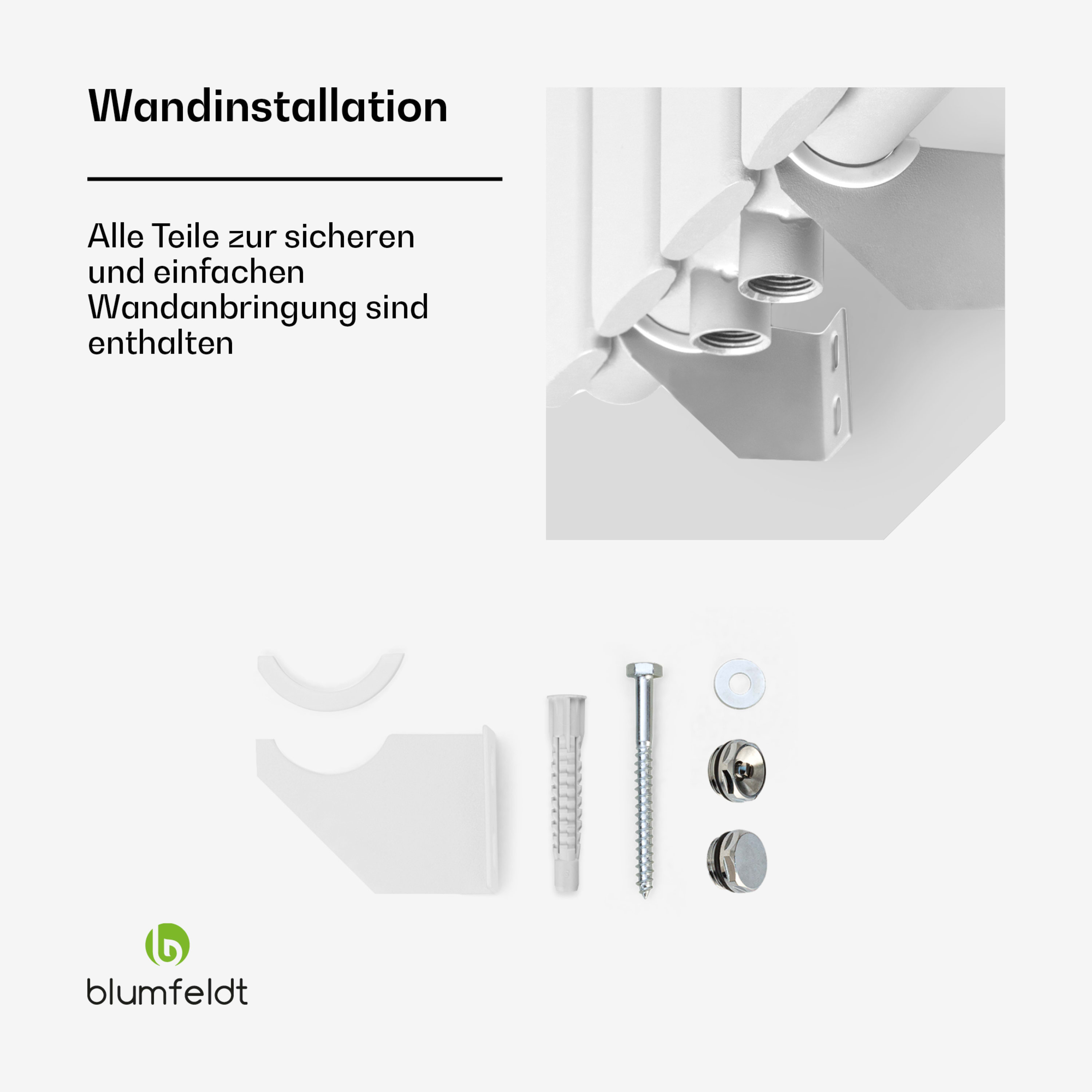 Der Blumfeldt Tallheo 41 x 180 cm Röhrenheizkörper integriert sich ganz umstandslos in ein vorhandenes Warmwasser- oder Fernwärmeheizsystem und arbeitet auch mit elektrischen Heizstab- oder elektronischen Thermostatsystemen. Dabei spendet er zuverlässige und gleichmäßige Wärme im Bad. Der Anschluss ist denkbar einfach: Die Bauweise ermöglicht den Anschluss in der Mitte oder an der Seite. Damit kann der Tallheo optimal auf zahlreiche bauliche Gegebenheiten reagieren. Auch die notwendigen Wandhalterungen sind direkt im Lieferumfang enthalten. Das stabile Röhrensystem aus Metall leitet und verteilt dabei optimal Wärme bis 70 °C. Durch seine 2x7 vertikalen Heizröhren verfügt er zudem über eine optimal vergrößerte Oberfläche und erreicht so Wärmeleistungen von bis zu 1435 Watt.