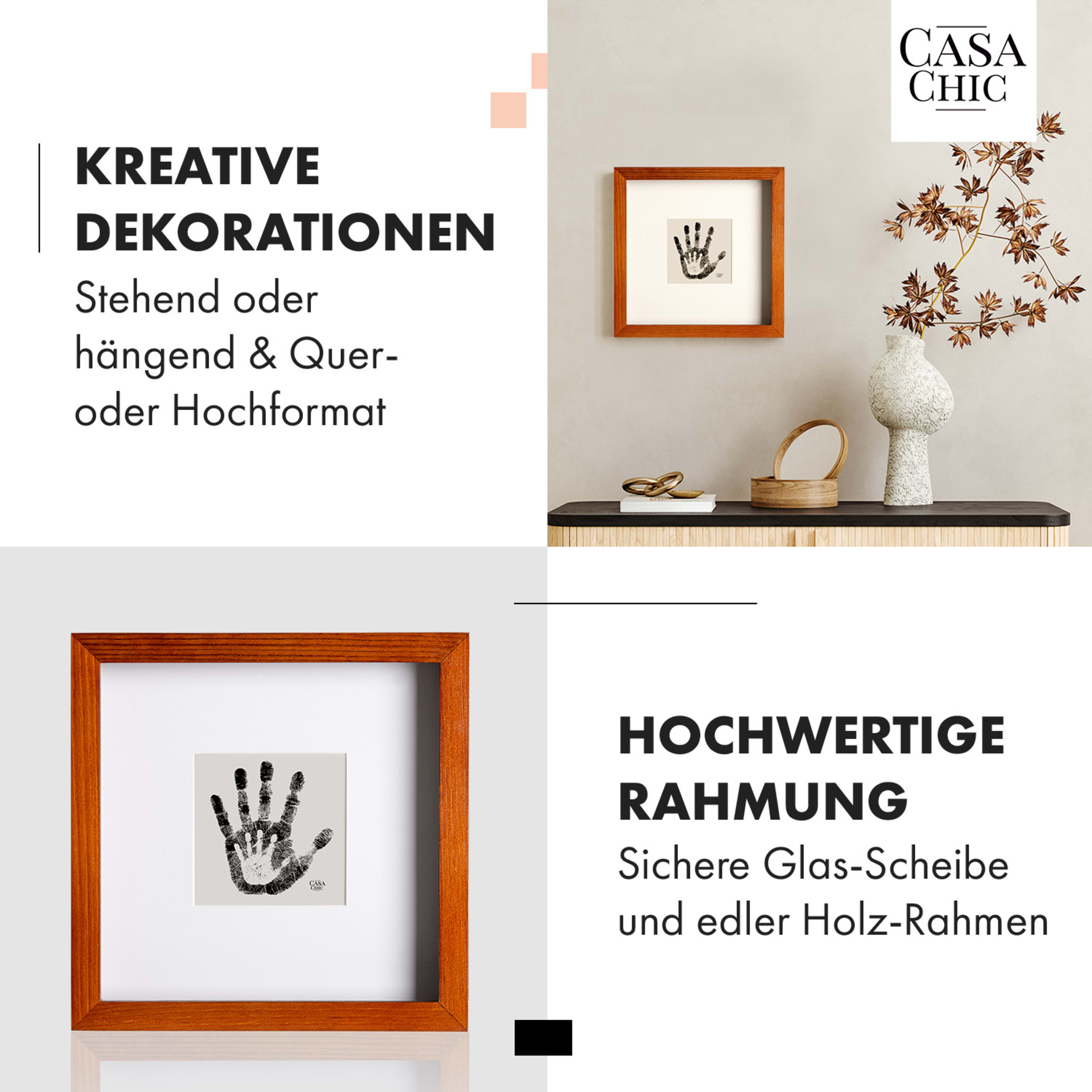 Une profondeur particulière pour vos images ! Vous pouvez utiliser le cadre photo Camden de Casa Chic by blumfeldt, fabriqué à la main et en bois véritable, aussi bien comme support que pour le montage mural. Grâce à sa profondeur, il convient parfaitement à la représentation d'objets en 3D. Outre le cadre-boîte pour les photos de 23 x 23 cm, le passe-partout avec une découpe de 10 x 10 cm permet également de mettre en scène des objets plus petits de manière particulièrement impressionnante. La vitre du cadre photo est fabriquée en verre véritable et renforce ainsi l'aspect noble du profil du cadre de 4,5 x 2 cm.