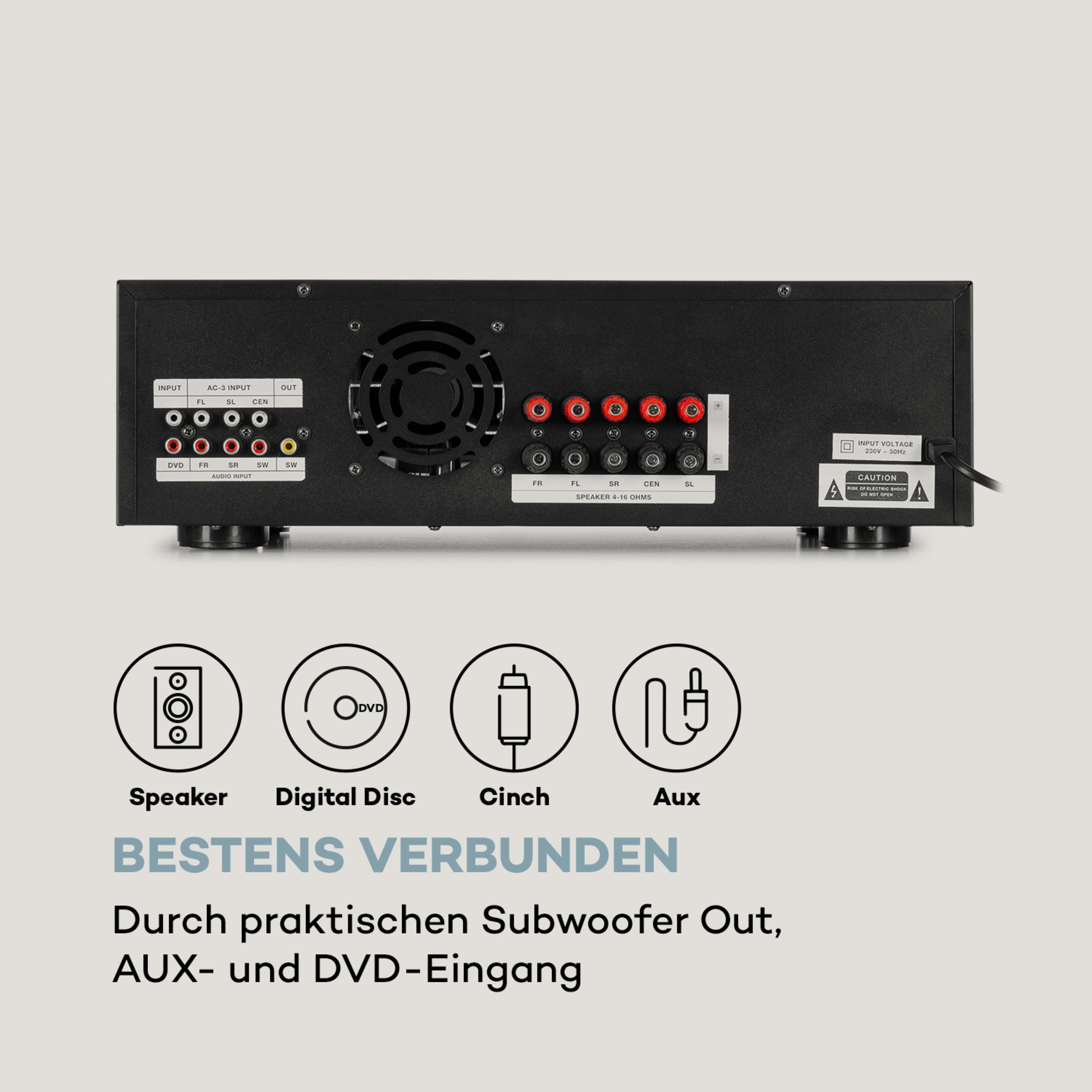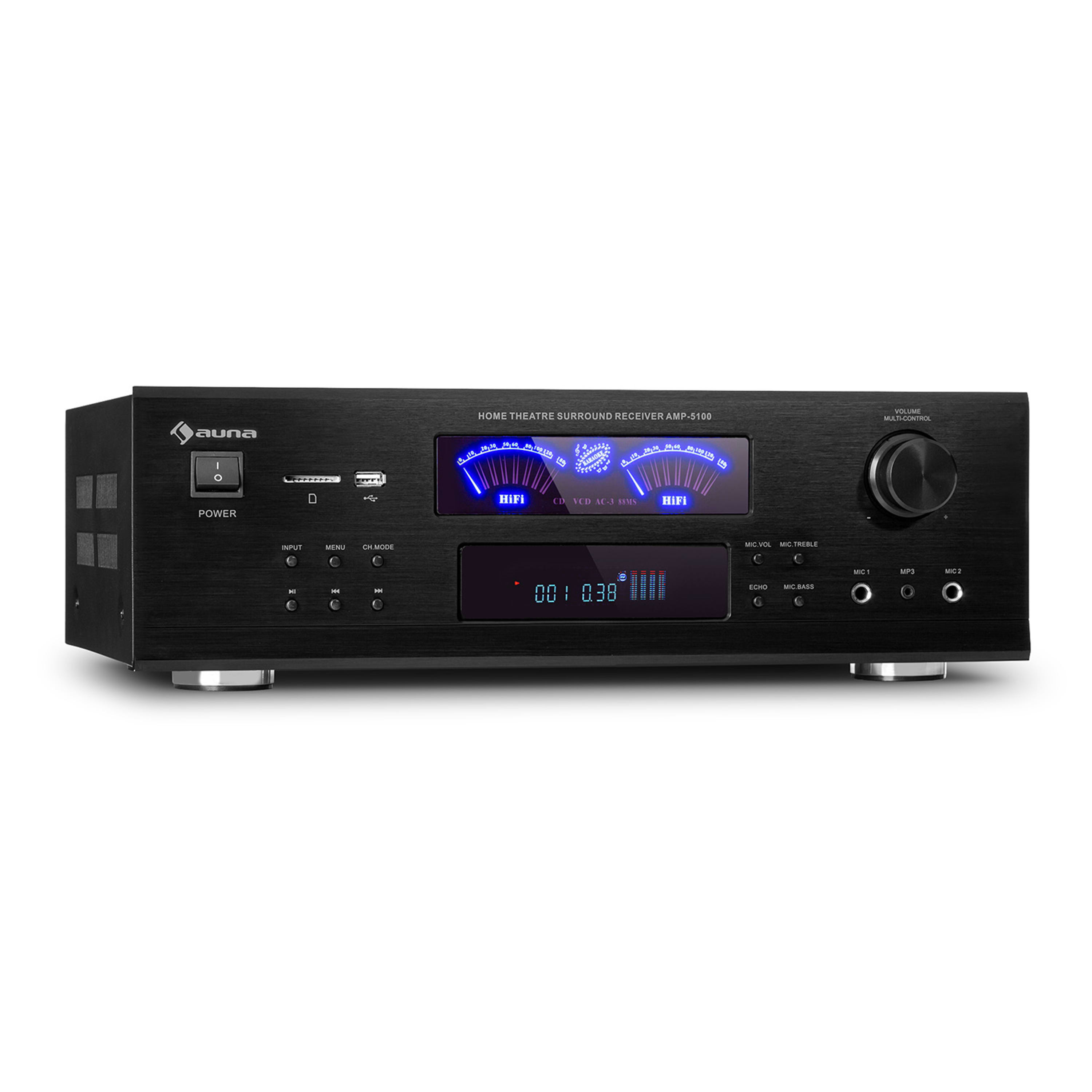 - Connessioni: 3 ingressi audio stereo cinch, 1 ingresso DVD stereo cinch, 1 uscita subwoofer cinch, set da 5 morsetti a vite per collegare gli altoparlanti, 1 ingresso antenna, 2 ingressi jack microfono da 6,3 mm (lato anteriore), 1 ingresso jack AUX da 3,5 mm (lato anteriore), 1 porta USB (lato anteriore), 1 slot SD (lato anteriore)