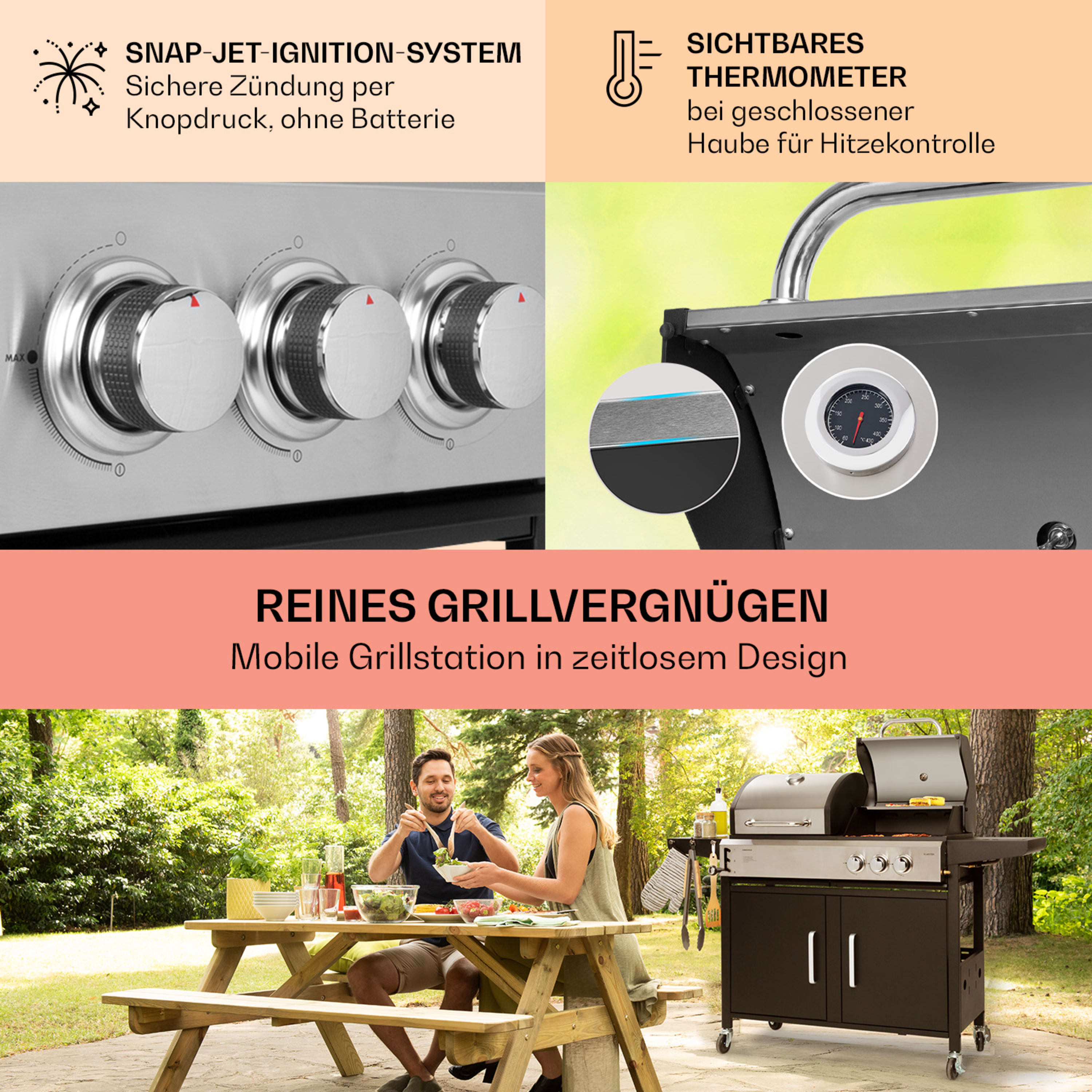 Che la stagione dei barbecue abbia inizio: la griglia combinata Kingsville di Klarstein può essere utilizzata con gas o carbonella e assicura sempre risultati straordinari. Con le sue ampie superfici per grigliare e l'elevata potenza termica, la preparazione di prelibatezze di ogni tipo diventa un vero piacere. L'accensione piezoelettrica garantisce un rapido avvio dei bruciatori grazie al sistema SNAP-JET Ignition: basta premere una manopola e la griglia 2 in 1 è pronta all'uso. Le prestazioni dei due bruciatori principali e di quello ausiliario in acciaio inox con una potenza complessiva di 8,1 kW permettono di grigliare al meglio una grande varietà di prelibatezze. Sulle due grandissime griglie di cottura in ghisa da 40 x 37,5 cm ciascuna, potrai cucinare a puntino bistecche e altre deliziose specialità a base di carne: grazie alle temperature elevate, la carne sarà sempre croccante fuori e tenera dentro. Il calore resta perfettamente all'interno grazie al coperchio a doppia parete in acciaio inox, mentre i due termometri integrati ti permettono di avere sempre sotto controllo le temperature.