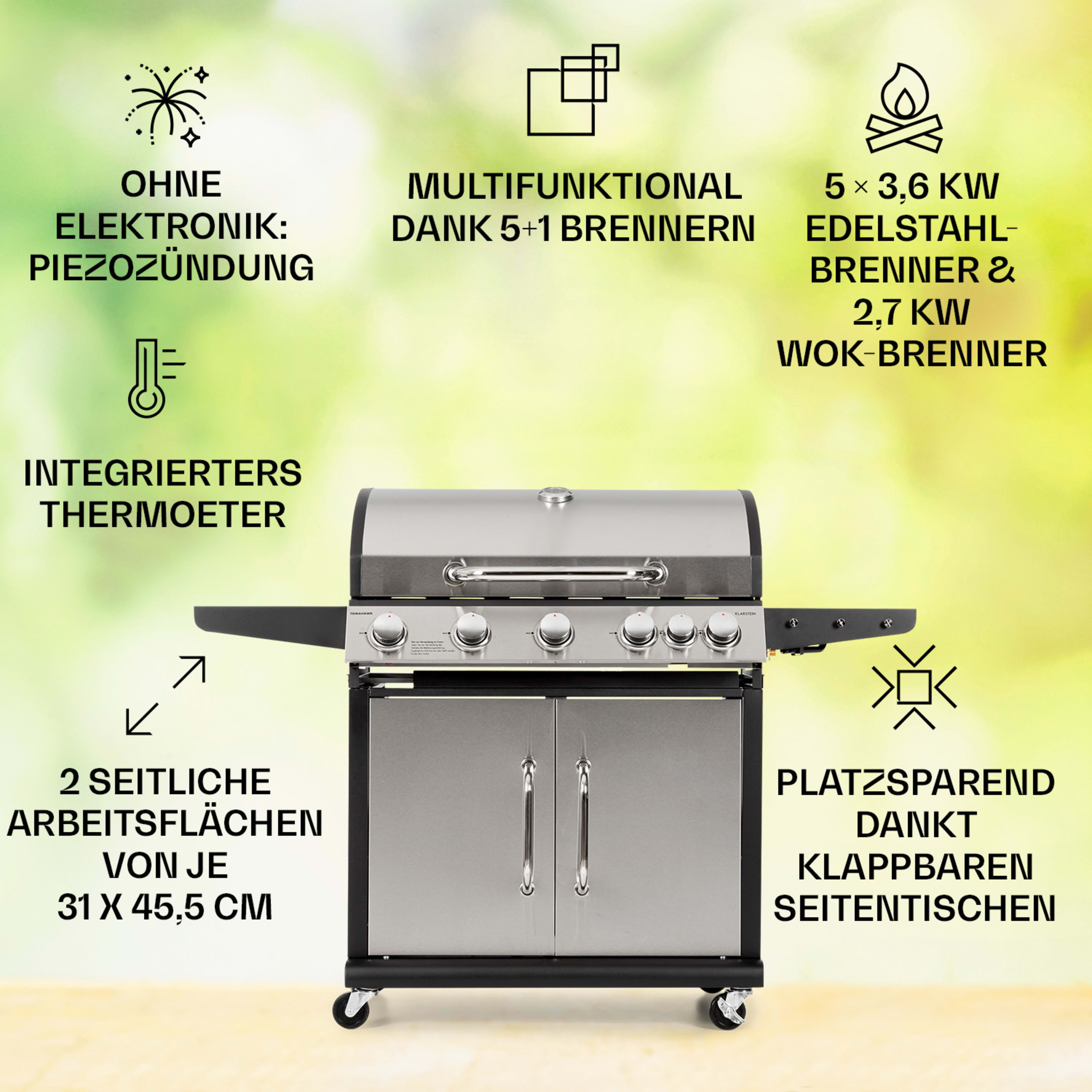 Cinque bruciatori da 3,6 kW di potenza ciascuno e uno aggiuntivo per wok da 2,7 kW garantiscono il calore necessario sotto la griglia. Grazie all'accensione piezoelettrica senza batteria, basta premere un tasto per avviare i bruciatori rapidamente e con la massima comodità. Il barbecue mette a disposizione un griglia in ghisa di 80 x 43,5 cm per pietanze di ogni tipo: bistecche saporite, succulente salsicce, deliziose verdure alla griglia o pesce cotto alla perfezione. La copertura in acciaio inox a doppia parete permette di preparare anche specialità con cottura indiretta, come pulled pork o spare ribs. Per particolari specialità, come verdure scottate o semplicemente per cucinare in padella, Tomahawk mette a disposizione un bruciatore per wok con 2,7 kW di potenza. Se non serve più, basta richiudere la copertura e si trasforma in un pratico tavolino laterale in acciaio inox. Questo tavolino e quello sul lato sinistro, entrambi da 31 x 45,5 cm, assicurano un sacco di spazio per ciotole, padelle, posate, bevande o spezie.