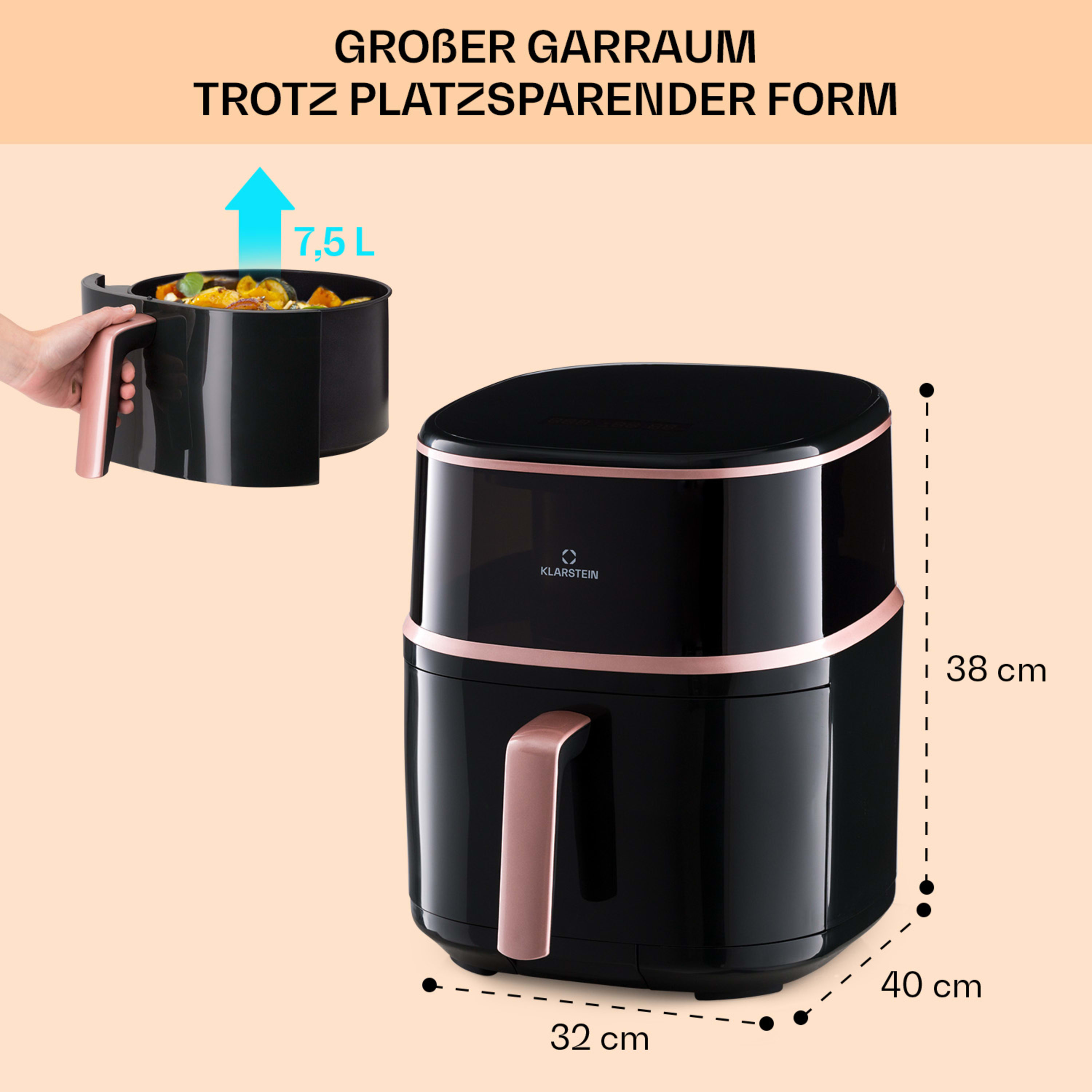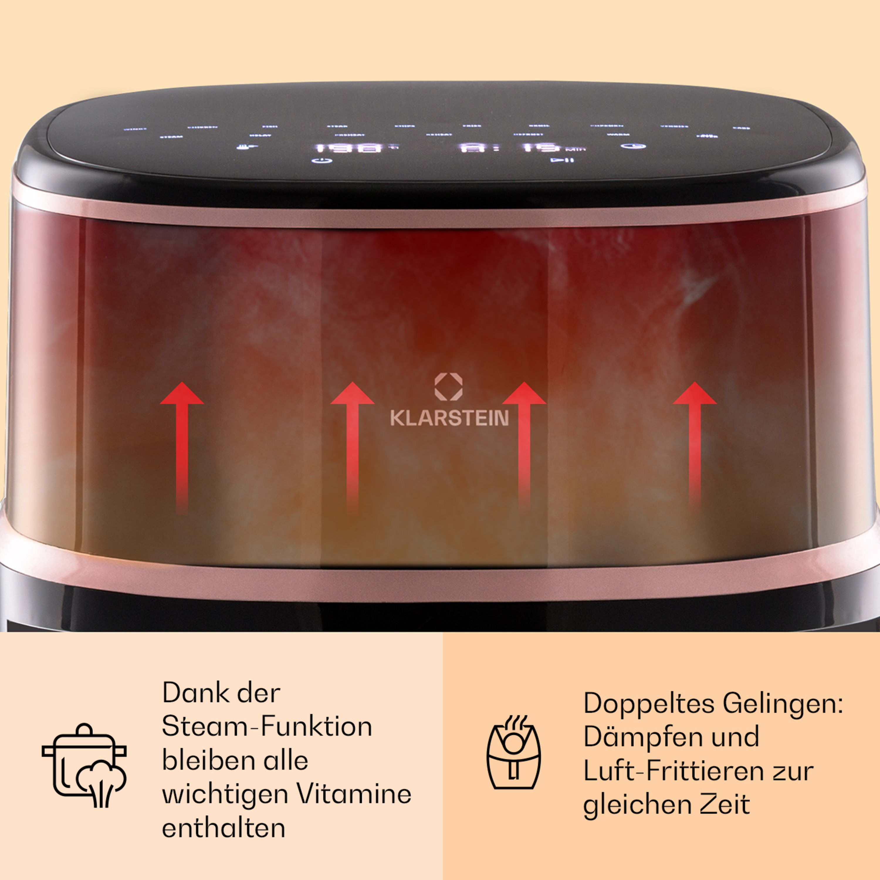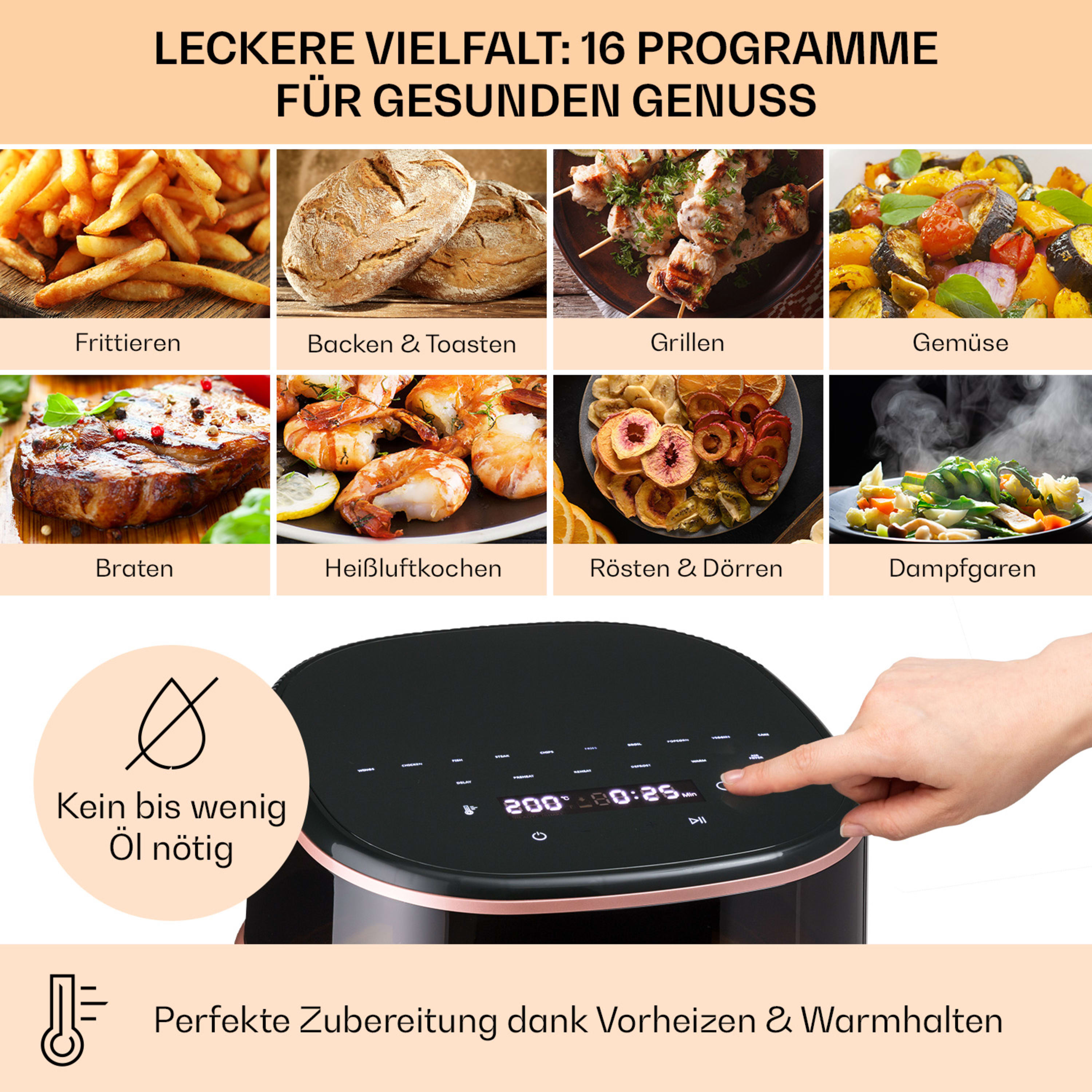 Con la friggitrice ad aria calda Air Bloom di Klarstein la cottura a basso contenuto di grassi non è mai stata così semplice e veloce. Il gusto eccellente viene mantenuto, perché grazie ai 1500 Watt di potenza e alla circolazione dell'aria calda, il calore viene distribuito in modo rapido e ottimale e il contenuto viene cotto delicatamente e rapidamente da tutti i lati. Con l'aiuto dell'elemento riscaldante alogeno, la friggitrice Air Bloom frigge, cuoce, griglia o arrostisce alla perfezione i tuoi cibi preferiti con temperature che vanno da 40 a 200 °C. La funzione vapore commutabile assicura in modo affidabile il contenuto di umidità ideale. Con i suoi 7,5 litri di volume, il cestello di frittura extra large offre spazio sufficiente per preparare una grande quantità di patatine fritte, cosce di pollo, ali di pollo ma anche verdure, pesce e persino torte. 16 programmi selezionabili semplificano il funzionamento e consentono di impostare in modo ottimale ogni metodo di cottura. Inoltre tutte le componenti non elettroniche sono lavabili in lavastoviglie