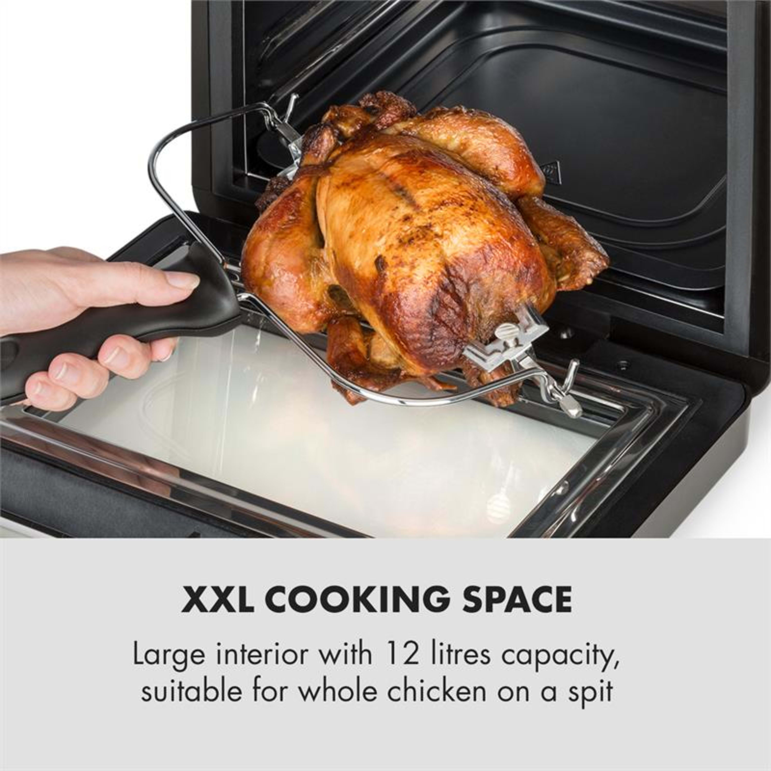 Like size, glass window, easy to use, and just love the spit. But at 12L it holds little more than my son's which is a different 5L style. Difficult to find chickens small enough for spit so wings have to be cut off or they hit the tray beneath while rotating. Made a brilliant job of roasting the chicken, absolutely fantastic. Very new so just learning. Don't be tempted to buy a cookery book written by American as I did, cheap book, Amazon published and not very helpful as mentions parts not on my fryer and ingredients different as is sizes so keep leafing to conversation table at back of book.