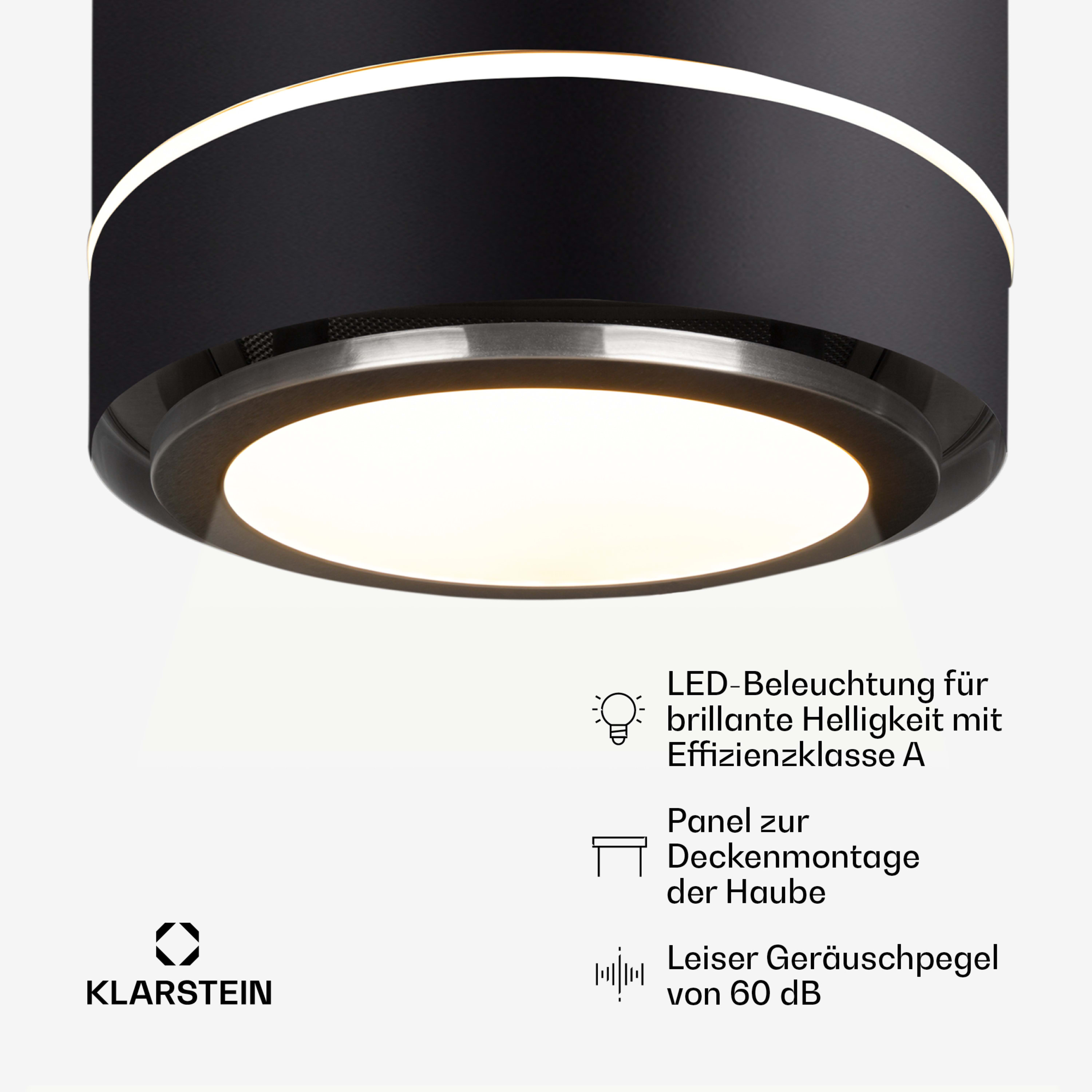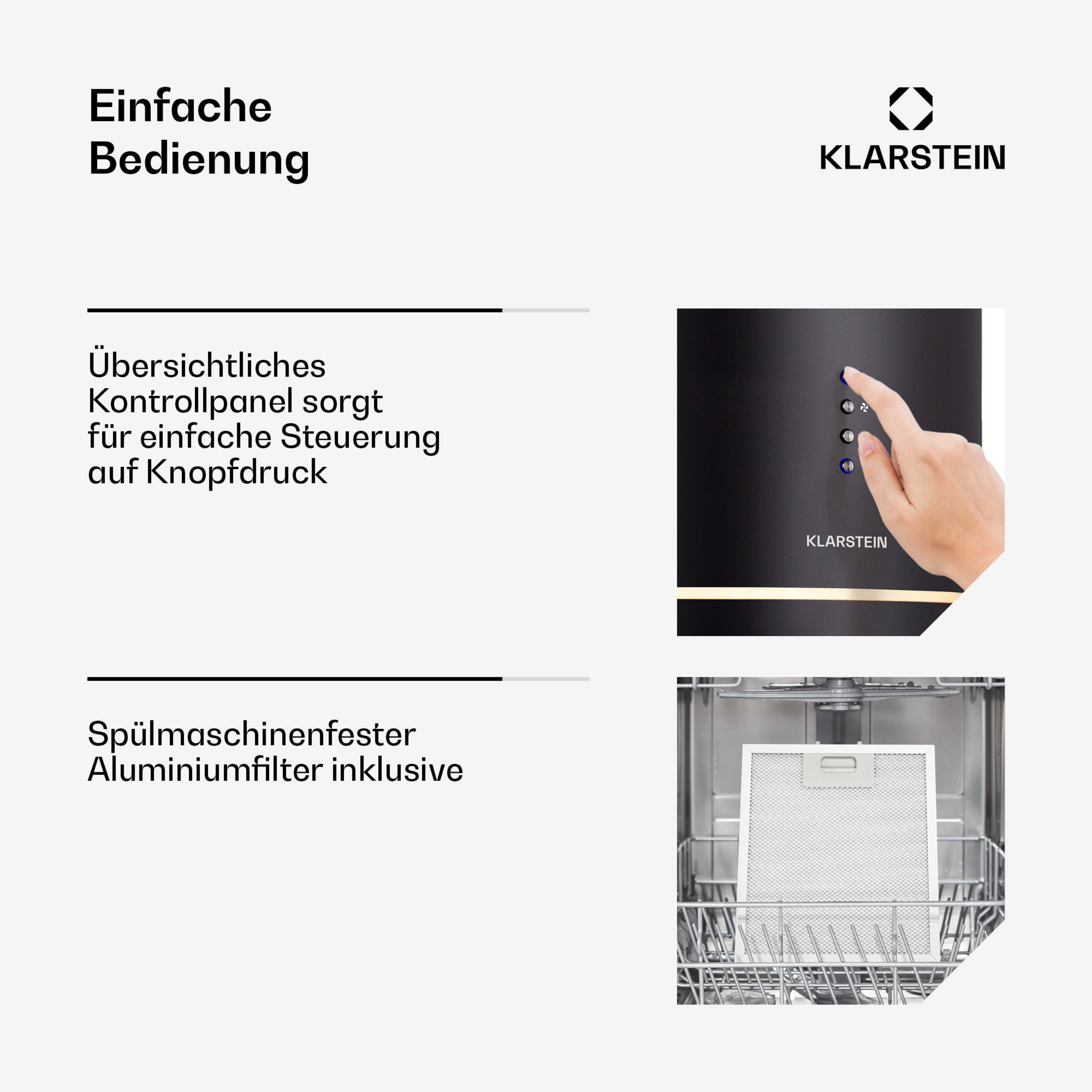 Die Optik ist gut und ansprechend. Da es verschiedene Ausführungen gib, achten Sie darauf 1. das nicht der Lampen- ring sonder 2 Strahle angebracht sind. 2. durch den Lampen-ring wird der Ansaugquerschnitt verringert. 3. der Querschnitt vom Ring ist ziemlich genau die Hälfte vom Querschnitt der Ansaugöffnung darunter 4. Sollten Sie versuchen das Gerät an einen Herd der an der Wand steht zu platzieren nicht ratsam. Die Abluft wird an die Decke geblasen und an dem Wänden runtergedrückt, dadurch entsteht zwischen Kochplatte und Abzugs-Fläche ein Horizontaler Luftstrom. Der geringe Querschnitt des Ansaug- rings schaft es dann nicht die Luft nach oben zu ziehen. Fazit die Luft wird nicht gereinigt. 5. Dieses Gerät ist aus den oben genanten Gründen nur geeignet für einen Herd mit Abzugsmöglichkeiten über die Außenwand oder wie in der Anleitung beschrieben über ein Insel-Koch-Feld. 6. die Kohlefilter sind viel zu teuer, es gibt viel günstigere aber die Fa. Klarstein hat leider eine Spezial-Größe die bis zu vier mal so teuer ist als die universellen. 7. die Aufbauanleitung ist gewöhnungsbedürftig und für Menschen mit zwei linken Händen völlig ungeeignet. 8. Das Gerät funktioniert, das Handicap ist der viel zu geringer Querschnitt des Ansaug-rings.