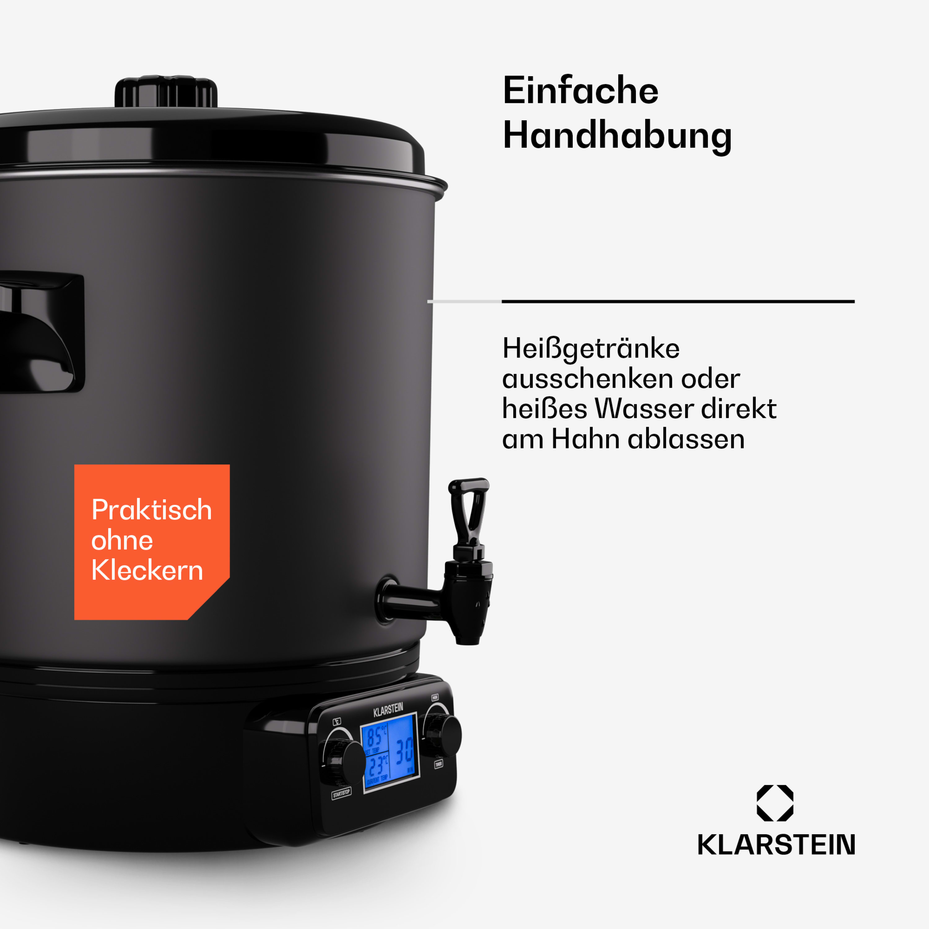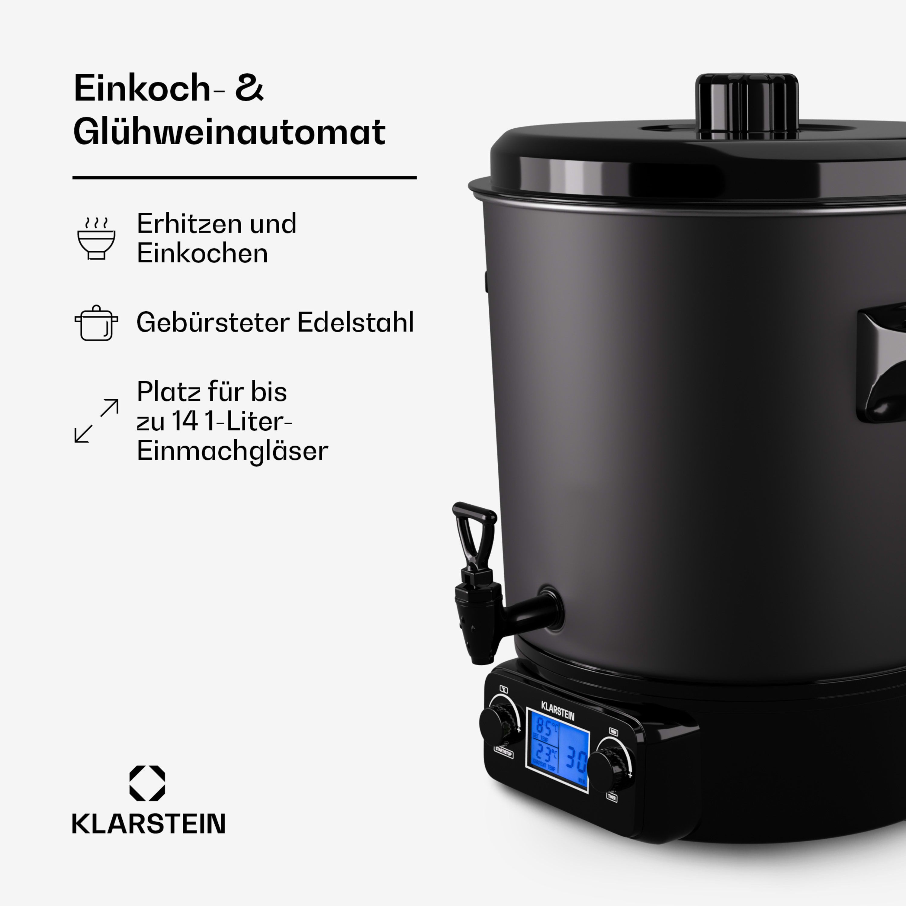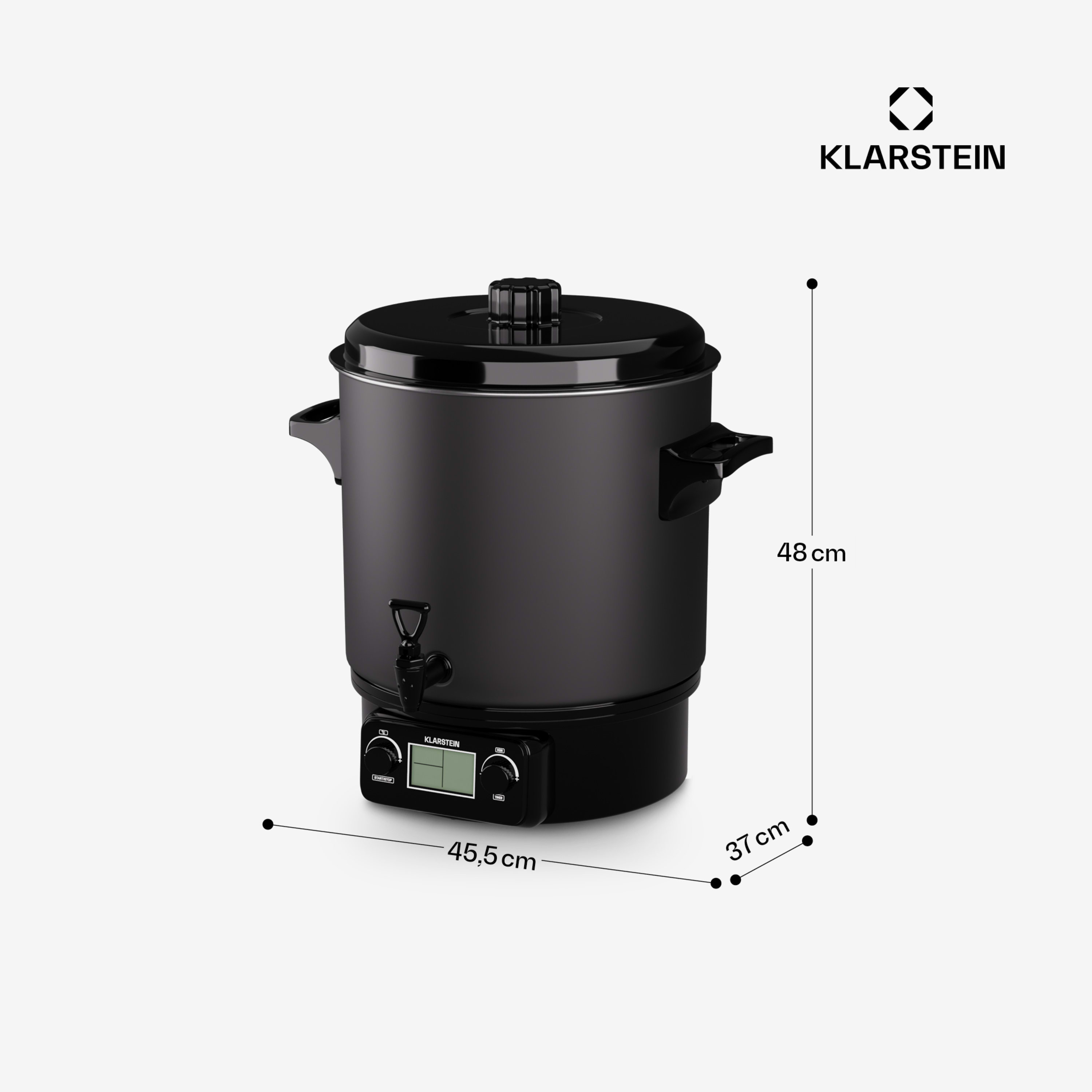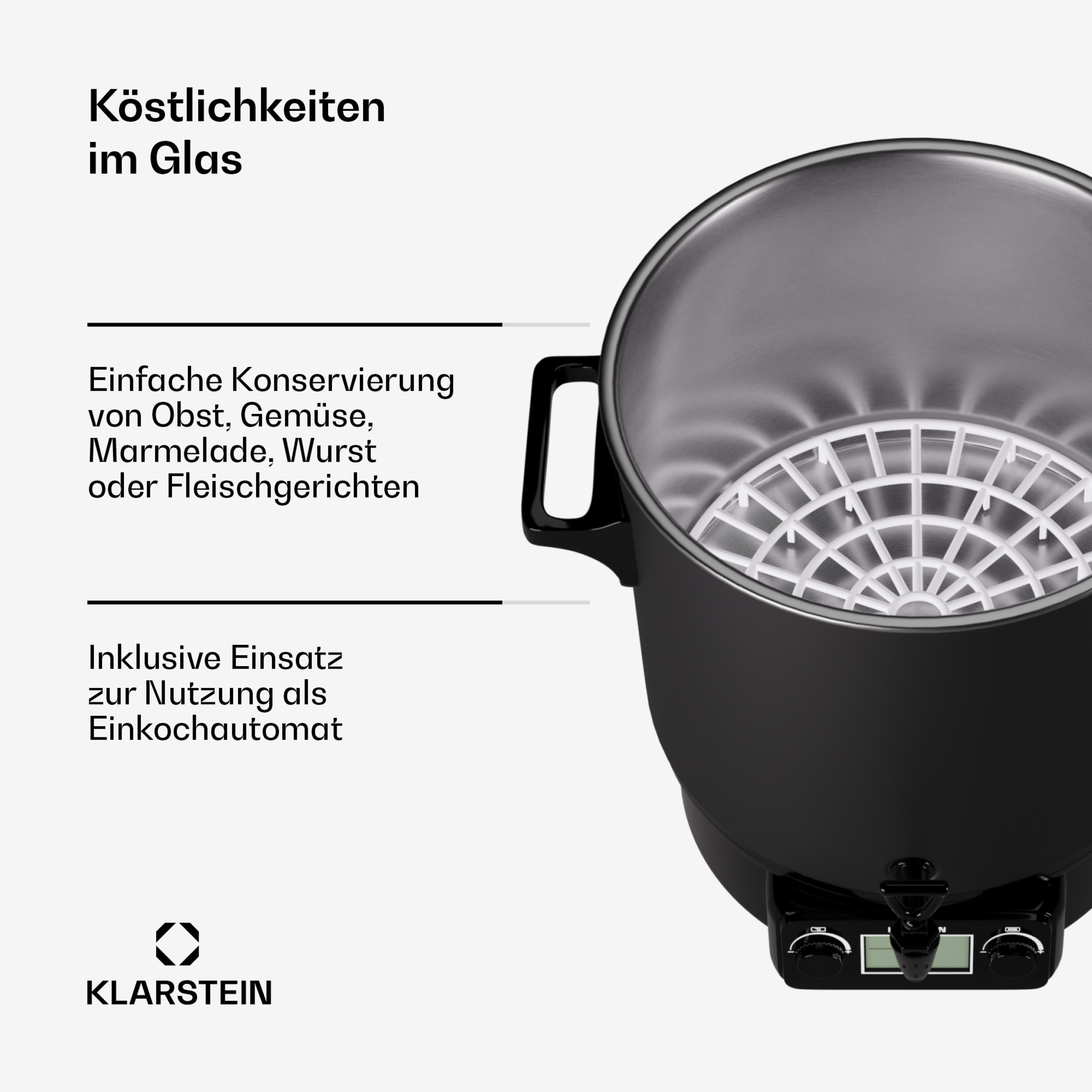 La macchina per conserve Biggie Digital di Klarstein è una pratica aiutante in cucina che consente di conservare facilmente gli alimenti in modo naturale, gustoso e sano. I prodotti migliori sono sempre quelli fatto in casa, sia che si tratti di frutta e verdura che di carne e salsicce. La grande pentola in acciaio inox, con una capacità di 27 litri, può contenere fino a 14 vasetti da un litro alla volta. La temperatura e la durata sono facilmente selezionabili tramite due manopole, dopodiché la macchina completamente automatica da 2000 watt funziona da sola e si spegne automaticamente allo scadere del timer. Il chiaro display digitale mostra la temperatura attuale all'interno e il tempo rimanente del timer. In qualità di distributore di bevande, Biggie Digital di Klarstein è dotato di un pratico rubinetto che può essere utilizzato per scaricare l'acqua o per erogare vin brulé, tè o succhi di frutta caldi.