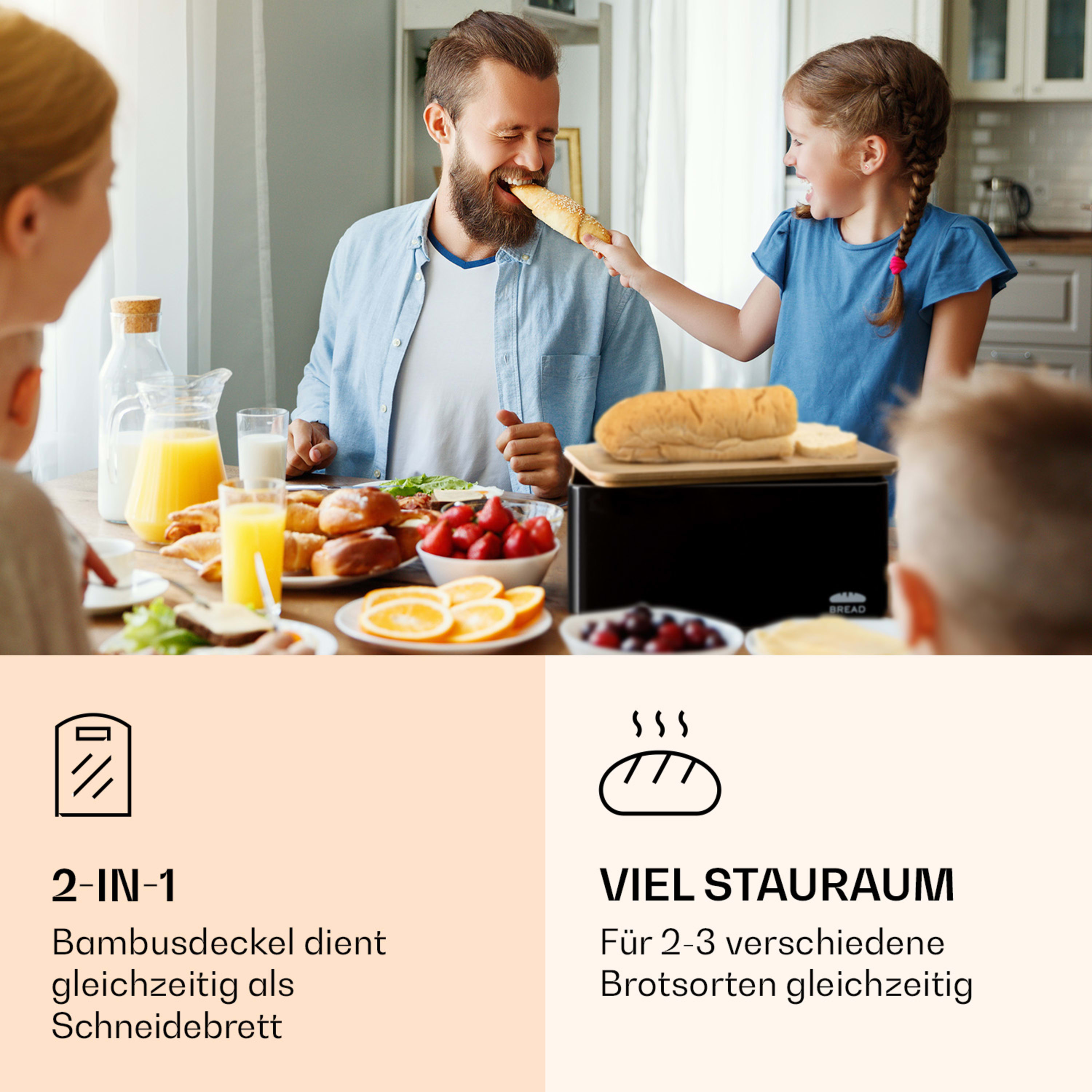 Sehr zurückhaltend schöner Brotkasten. Im Aufbau sehr simpel, was die Reinigung erleichtert. Den Deckel kann man auch als Schneidebrett verwenden, was wir aber nicht tun, damit er so schön bleibt. Der Kasten ist sehr geräumig, sodass mind. zwei handelsübliche Brote reinpassen. Was uns am Design zusätzlich gefällt ist, dass auf seltsame Muster oder Schriften darauf verzichtet wurde, bis auf das ganz kleine Motiv, was man auch noch hätte weglassen können.
