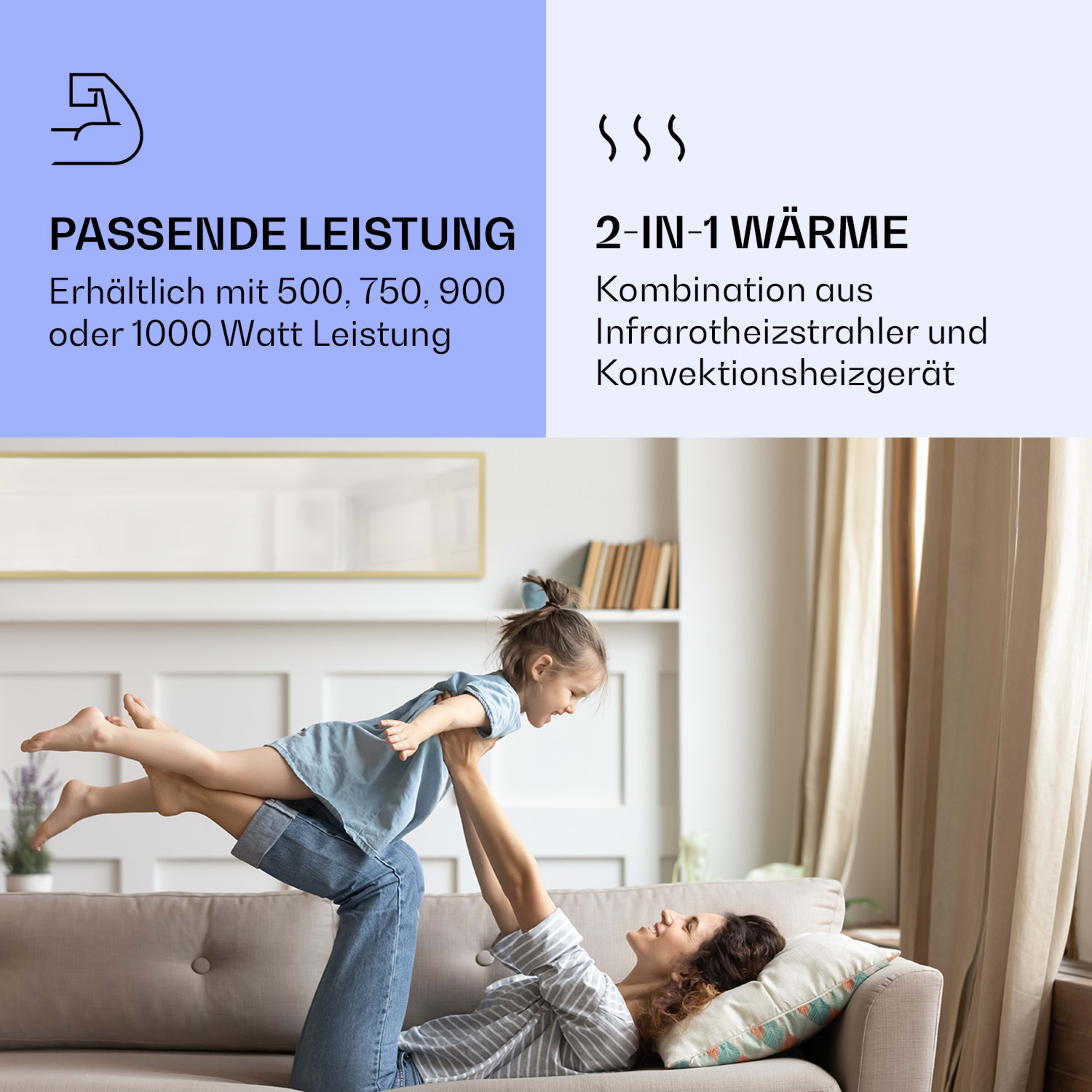 Il doppio della potenza con le stesse dimensioni, le stufe 2-in-1La Palma di Klarstein combinano sapientemente una stufa a infrarossi con una a termoconvezione e così non solo emanano rapidamente un calore a infrarossi avvertibile sfruttando un design salvaspazio, ma generano anche una piacevole aria calda nella stanza attraverso il calore emesso dal retro. A seconda delle dimensioni della vostra stanza, è possibile scegliere tra una stufa 500, 750, 900 o 1000 watt. Il termostato regolabile per gradi e il timer settimanale sono controllati in modo molto intelligente tramite l'app di Klarstein o tramite telecomando. Grazie al grado di protezione IP24, i termoconvettori sono ideali anche per il bagno, dove sono doppiamente utili grazie alla parte anteriore specchiata con rivestimento antiappannamento. La versione da 900 watt è adatta anche come unità a pavimento e può quindi generare un calore piacevole nella camera da letto svolgendo inoltre la funzione di specchio.